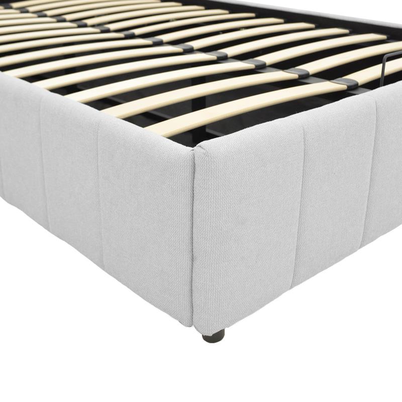 The bed features an easy-to-use mattress lift mechanism, which reveals a spacious storage area underneath. This makes it exceptionally easy to organize linens, pillows, out-of-season clothing, or other items, effectively contributing to the organization and tidiness of the space.