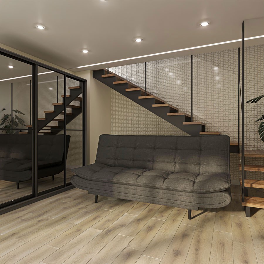 Upgrade your space with the compact Huston sofa bed, an ideal choice for those looking for modern design without compromising on practicality, in a modern gray fabric shade. Thanks to the reliable click-clack mechanism, the sofa quickly and easily converts into a comfortable semi-double bed, offering an easy and immediate solution to accommodate additional people.