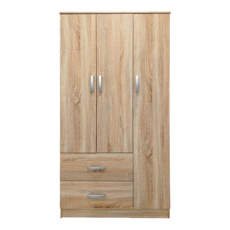 Includes three doors; internally it has a hanging rail and shelves, while the bottom part features two large drawers for storing clothes and accessories.