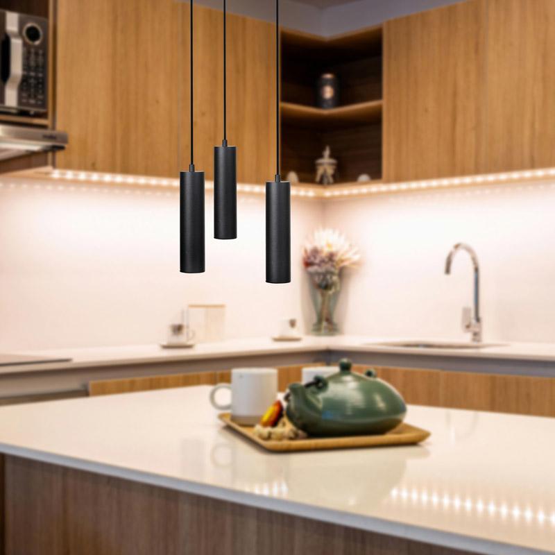 Give your space a modern touch with this elegant and timeless pendant light. Made of durable metal with a black matte finish, this three-light fixture combines simplicity and industrial style. Ideal for placement above a dining table, vanity or in the hallway, it offers concentrated lighting that creates a warm atmosphere.