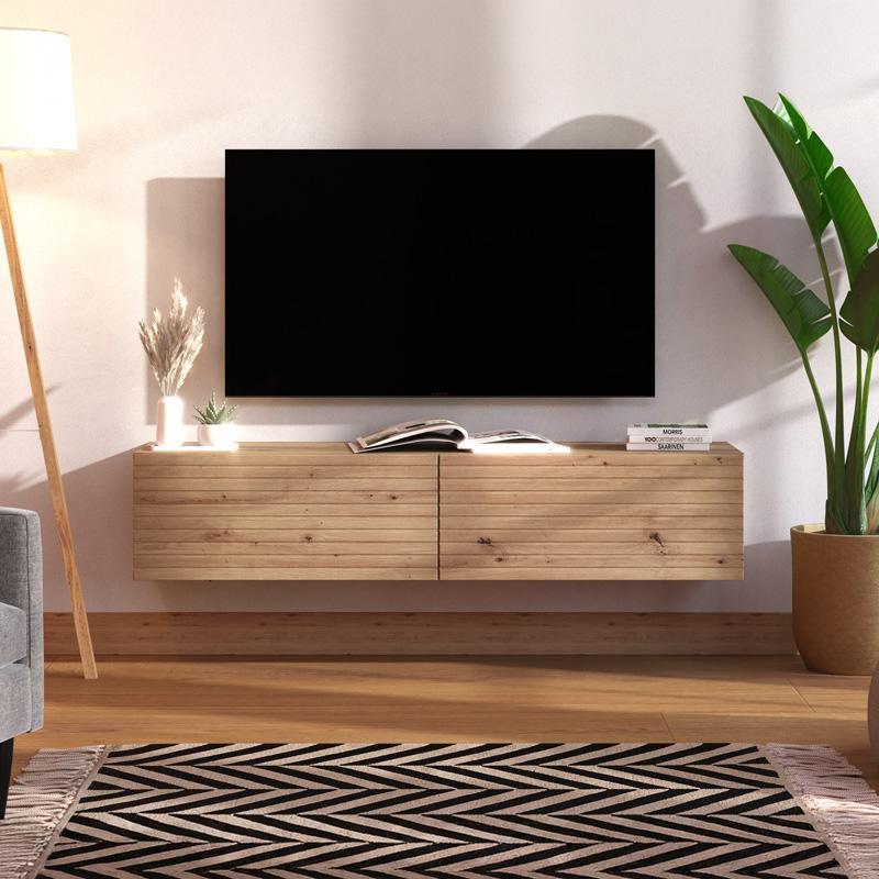 The furniture is wall-mounted, which allows it to save floor space and offers a sense of lightness and modern aesthetics to the space. With the combination of modern design and practicality, this wall-mounted TV stand is the perfect solution to organize your space with style and functionality.practicality.