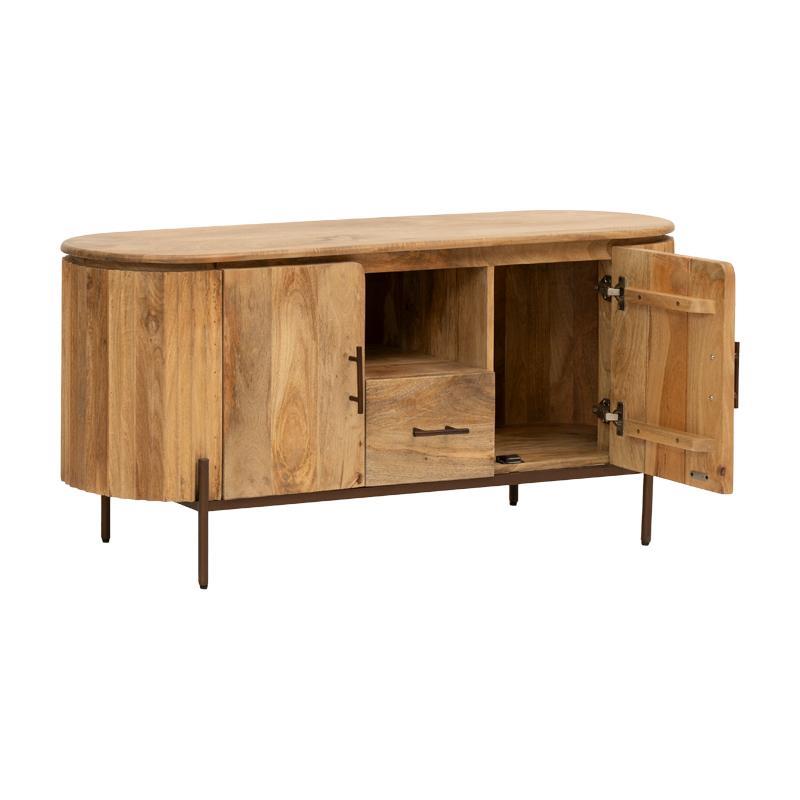 Its design includes spacious cabinets, a practical drawer, and an open shelf, providing ample storage space for your electronic devices, decorative items, and essential accessories. The iron legs enhance the stability of the furniture while adding an industrial touch, making it a perfect fit for both modern and classic interiors.