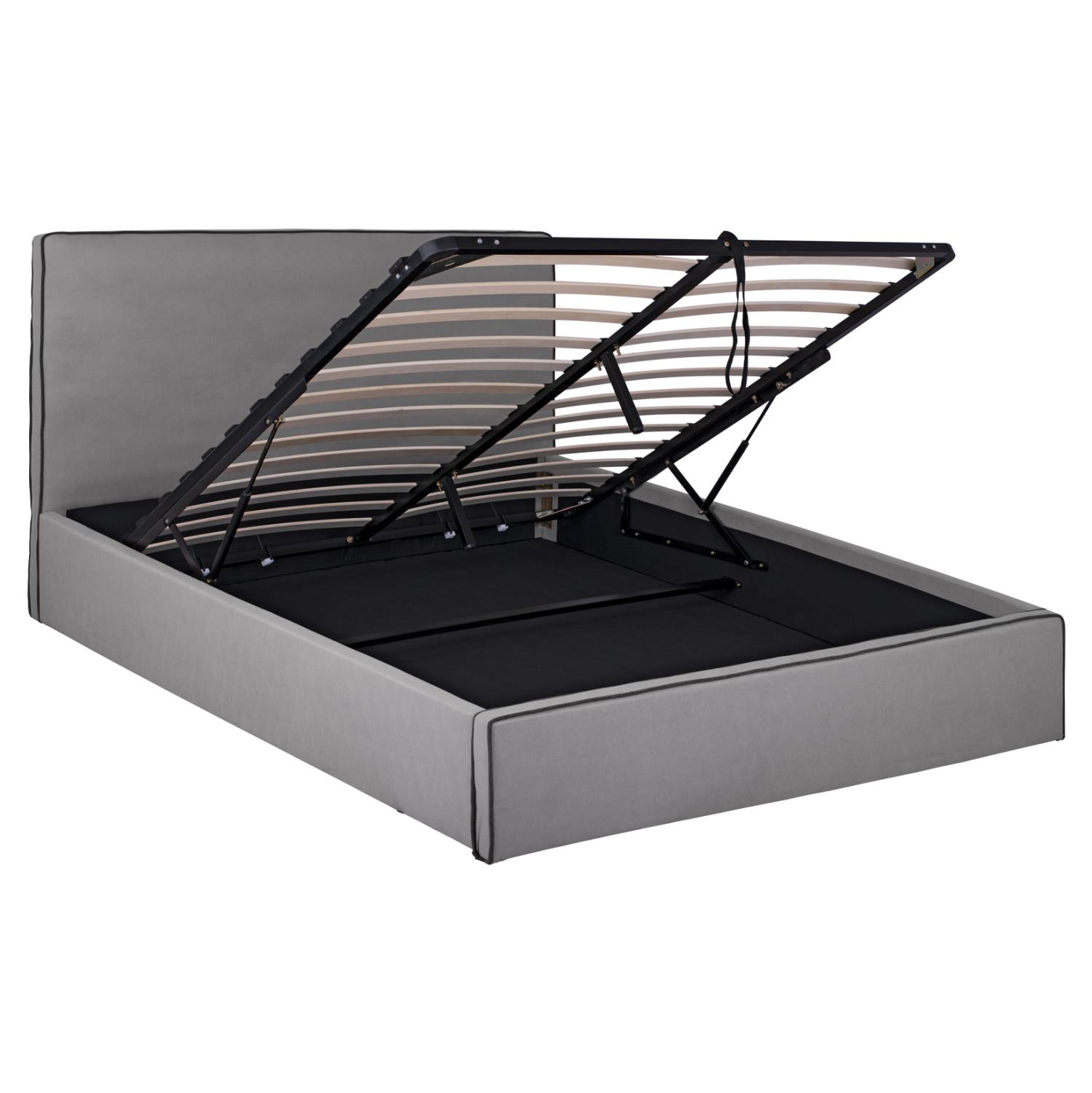 • The ALLIE bed in the size of a king-size mattress is attractively simple, it does not have a high footboard, but it does have a relatively high headboard. The main feature, however, is the upholstery of the entire bed with GREY fabric that gives the feeling of luxury and warmth, with a black rail running along all the edges of the bed. The mattress rests on traditional but ergonomic slats, which are placed on a metal frame that is lifted with a strap, offering a large storage space. An ideal choice for professional use too!