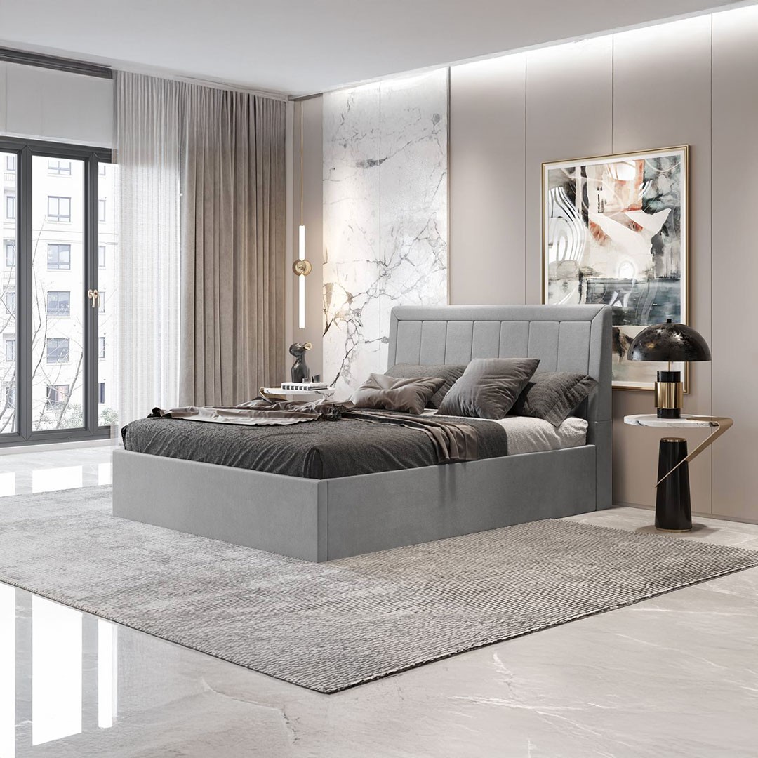 FRAME features a beautiful headboard design with straight seams and a perimeter frame-like upholstery while it is upholstered in a soft gray fabric shade. Its design is completed with the sides of the bed as well as its back touching the ground, creating a single, clean set that not only prevents the accumulation of dust under the bed, but also functions as a practical trunk-type storage space. Thus, sheets, duvets or personal items find their own, discreet place.