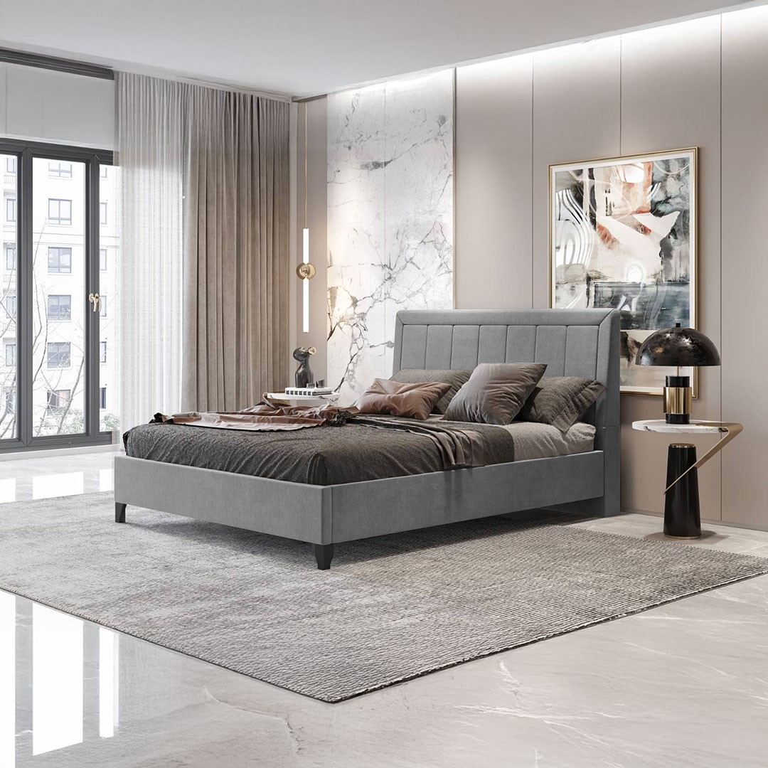 FRAME features a beautiful headboard design with straight seams and a frame-like perimeter upholstery while being upholstered in a soft gray fabric shade, offering a feeling of warmth and comfort from the very first moment. Its metal legs add a modern touch of lightness, making the bed give the impression of “floating” in space. Its sturdy construction ensures durability and long-lasting use, while its timeless appearance blends harmoniously with any decorative style.