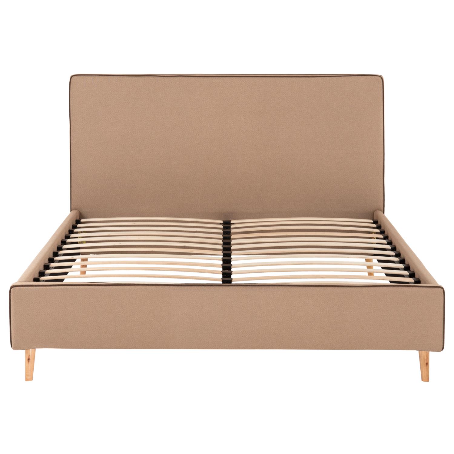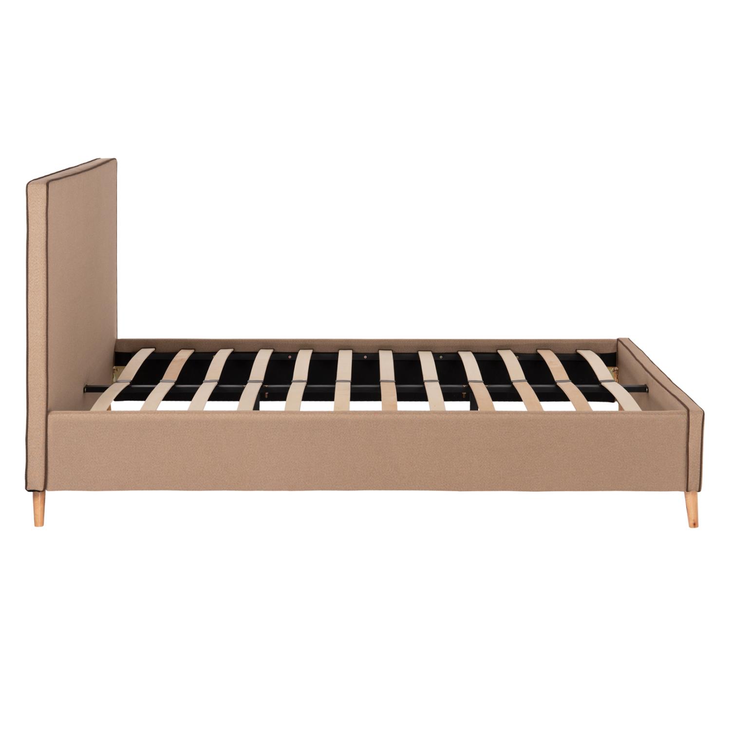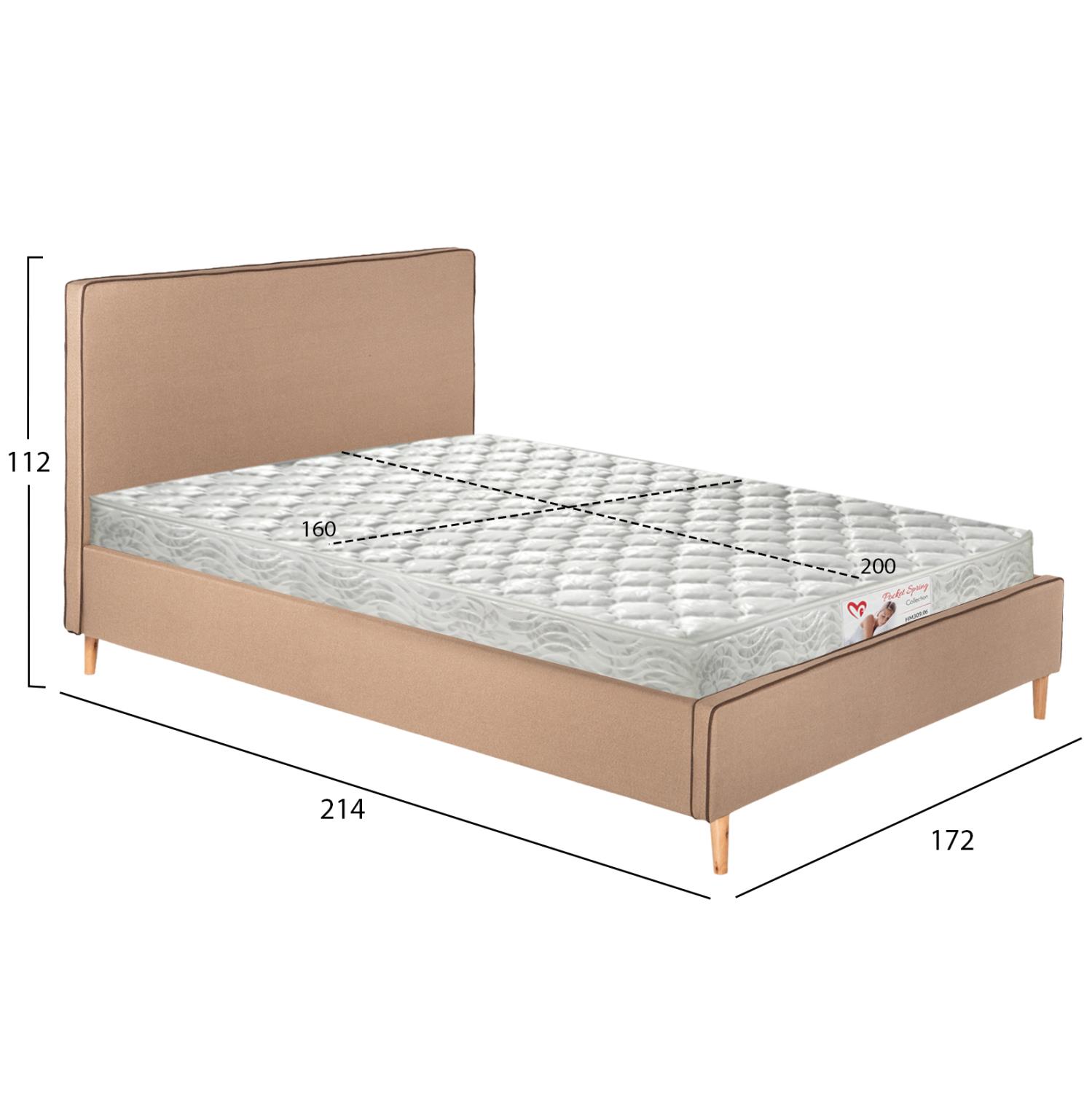 The INDRA king-size bed is upholstered in BEIGE fabric with BROWN railing at the seams. The mattress that accompanies the bed is placed on two rows of anatomical slats, is double-sided and has pocket springs technology (independent springs). The legs are wooden in natural color.