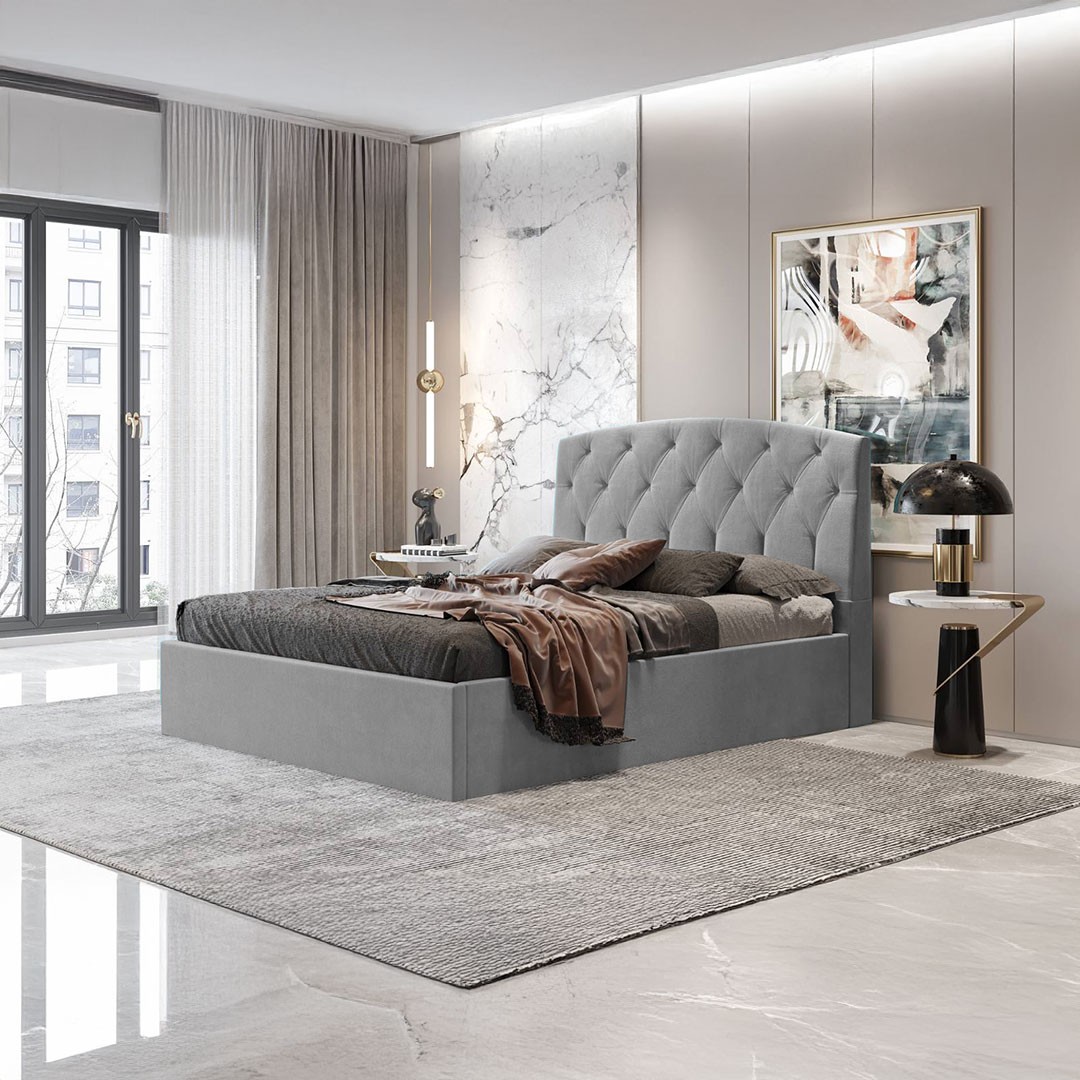 The impressive quilted headboard of the ROYAL exudes timeless luxury, while the fabric upholstery in a gray shade gives a modern and warm aesthetic that matches any decor. As a double bed, it ensures comfortable space and impeccable everyday functionality.