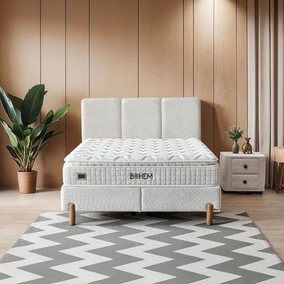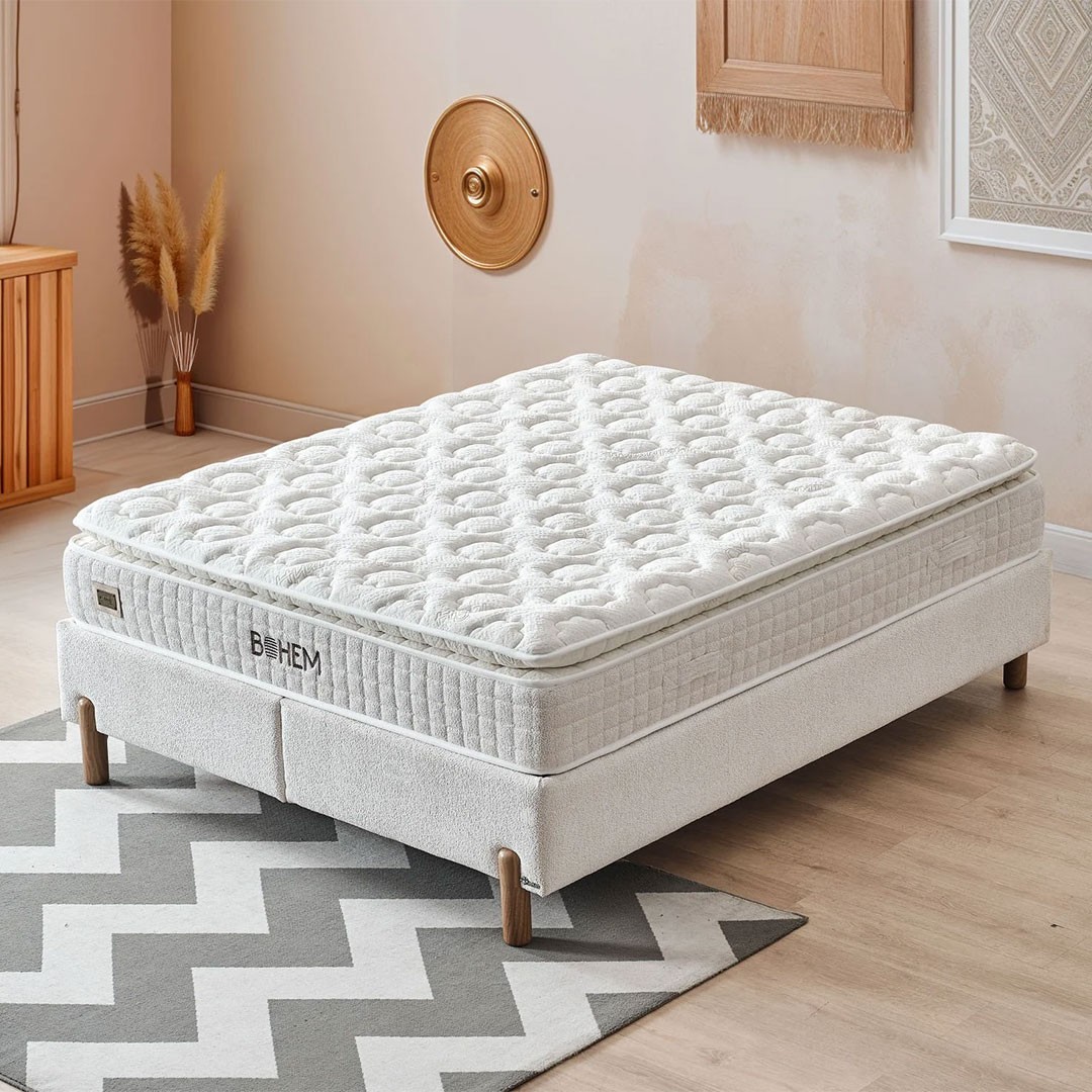 The set also consists of the anatomically supported double mattress, which not only offers excellent support but also upgrades your sleeping experience with the special Pocket Spring spring system. The system of independent springs follows the natural curves of your body, providing equal support to every part of the body and offering maximum comfort. It also features a velvet topper, increasing softness and comfort, while the hyaluronic fabric of the mattress moisturizes your skin and enhances its elasticity. Designed for both durability and comfort, the Bohem mattress ensures a restful and relaxing sleep experience every night.