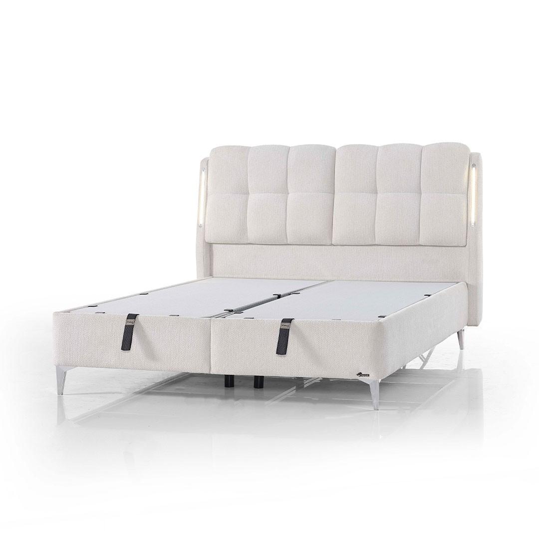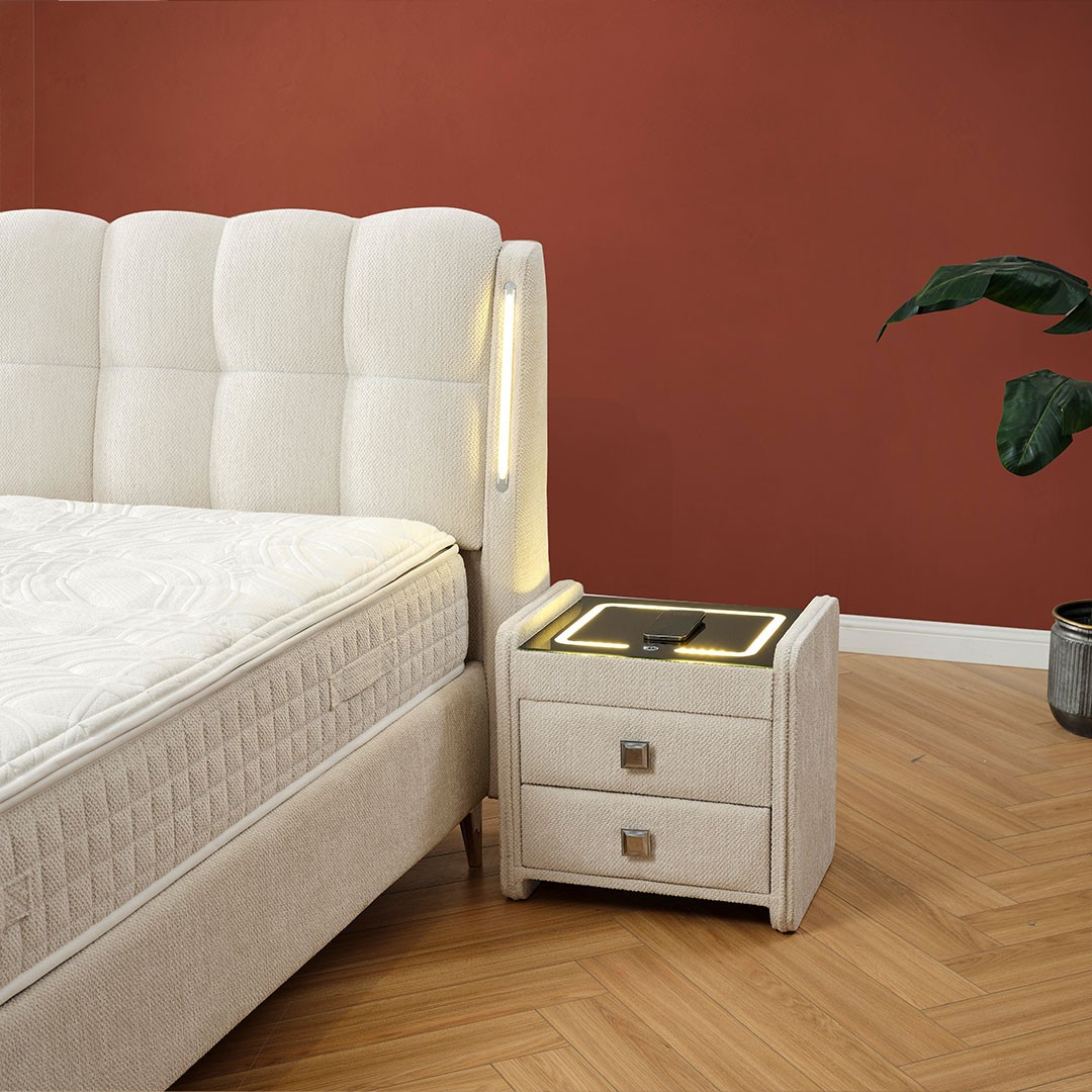 Take your bedroom space to the next level with this unique SLEEP FIT mattress bed set and take advantage of its excellent offer. The upholstered SLEEP FIT bed, in bright and modern boucle fabric in an elegant beige shade, combines contemporary design and absolute practicality – ideal elements for a modern bedroom with character. It stands out for its impressive quilted headboard, which is aesthetically upgraded with discreet LED lighting, creating an atmosphere of relaxation and luxury in your space.
