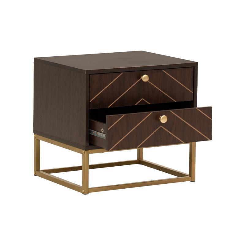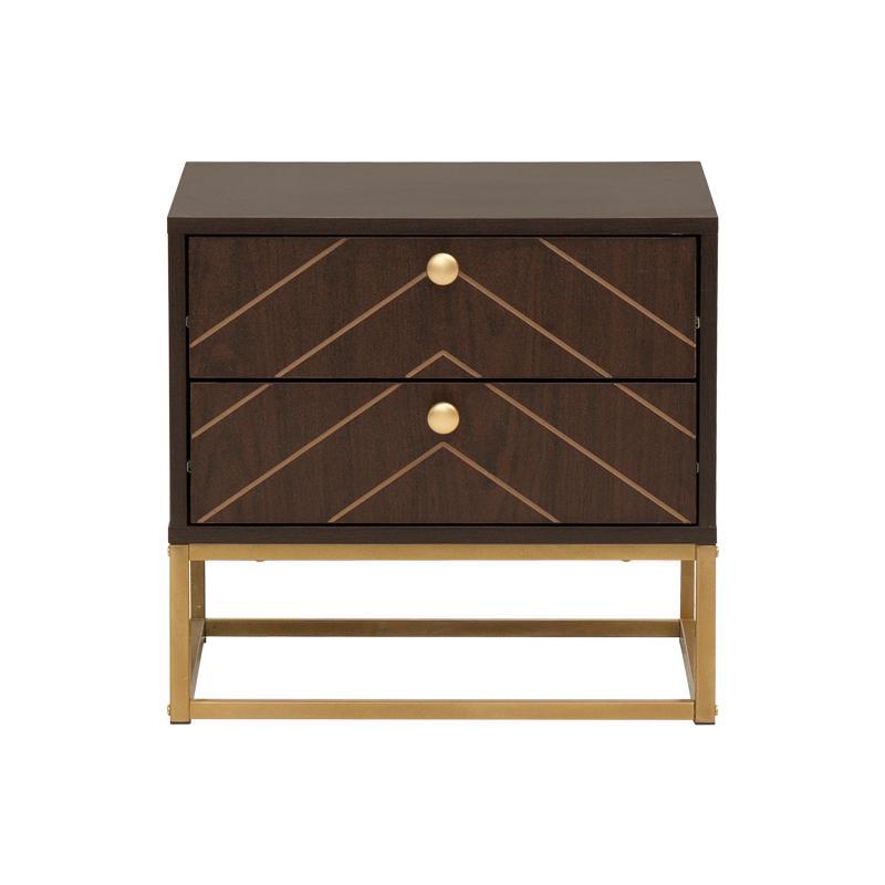 The frame color is a warm brown tone, providing a cozy and earthy feel, while the golden legs add a touch of luxury and striking contrast. The wooden nightstand is made from melamine and metal legs, ensuring excellent durability and stability.