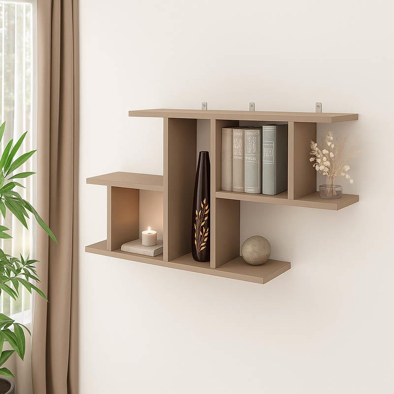 The Vertoura wall shelf is distinguished by its modern and minimalist design, offering a light and bright aesthetic to the space. Its mocha shade creates a sense of cleanliness and spaciousness, while the asymmetrical shelves add an interesting visual play and offer various spaces for displaying decorations or organizing objects.