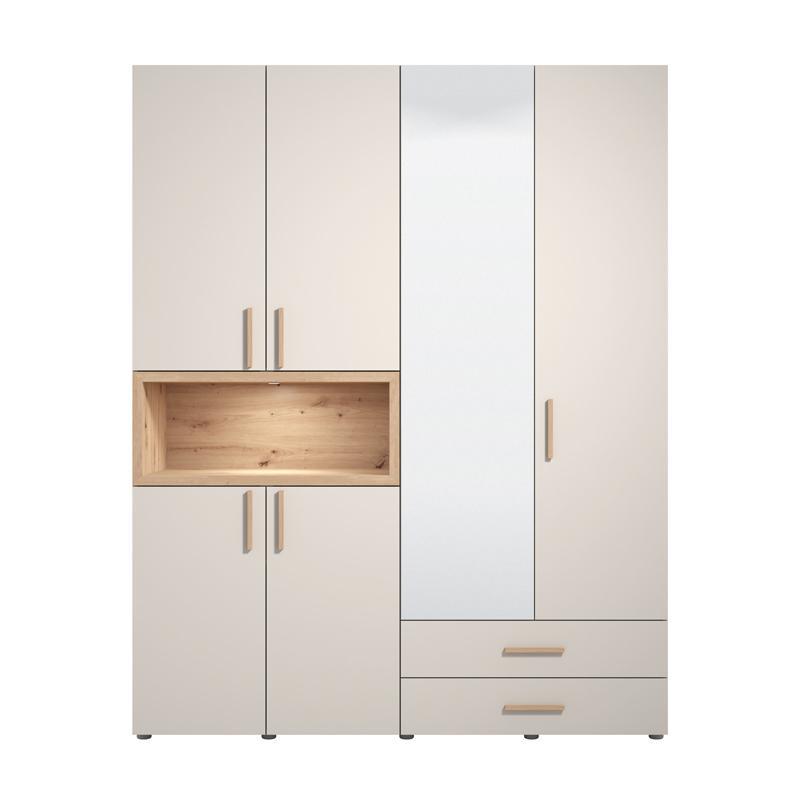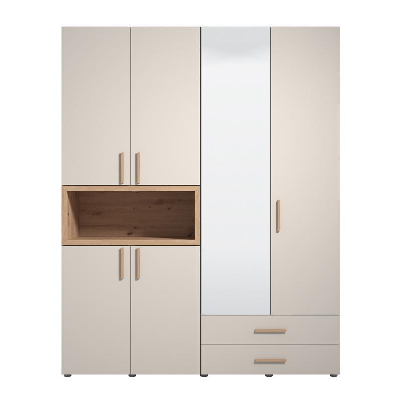 The DONALD 4K2F1O wardrobe offers an ideal solution for tidying up and organizing the bedroom, combining large capacity with elegant aesthetics. Four-leaf in design, it features two external drawers for easy storage of smaller items and a mirror on one leaf, adding functionality and style to the space.