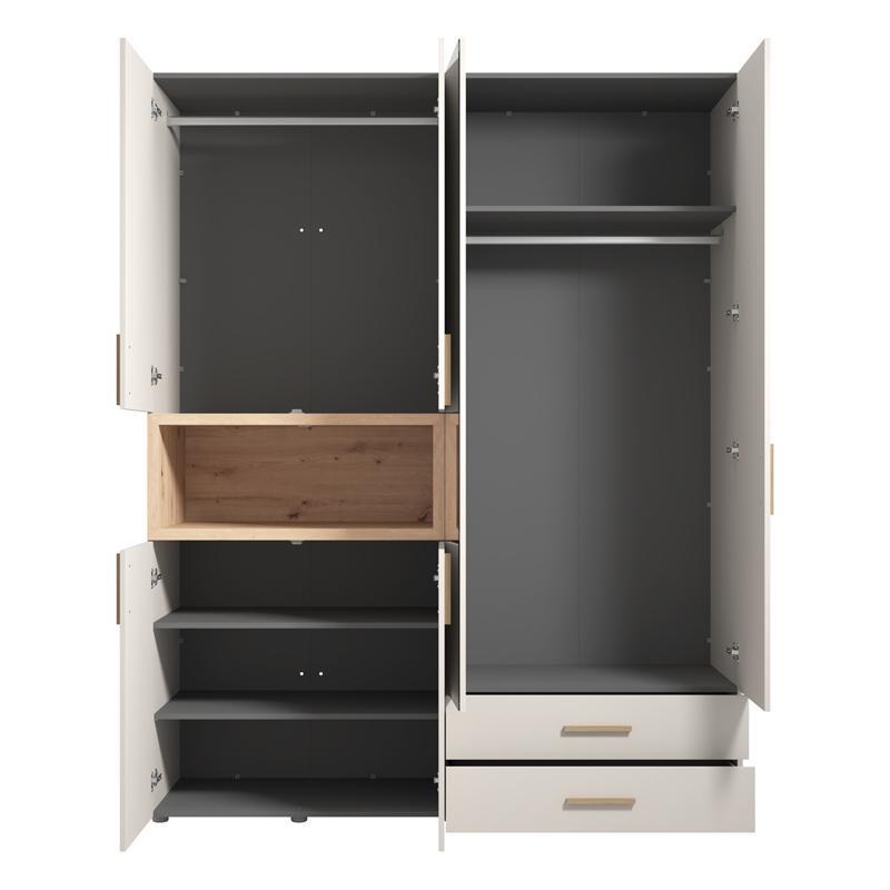 Inside, the wardrobe is designed with a smart arrangement of shelves and space for hangers, offering ample space for clothes, shoes and accessories. With a durable construction and timeless aesthetics, the DONALD 4K2F1O is a complete storage solution that combines practicality, usability and elegance in every detail.