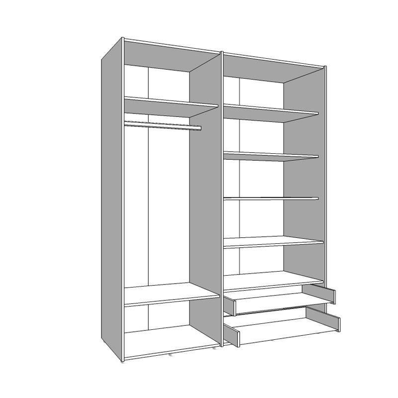 Its internal layout includes a variety of storage spaces, as its left section has a clothes rail and a space at the top as a loft, while its right section has 2 doors where inside there are 3 shelves creating 4 storage spaces.
