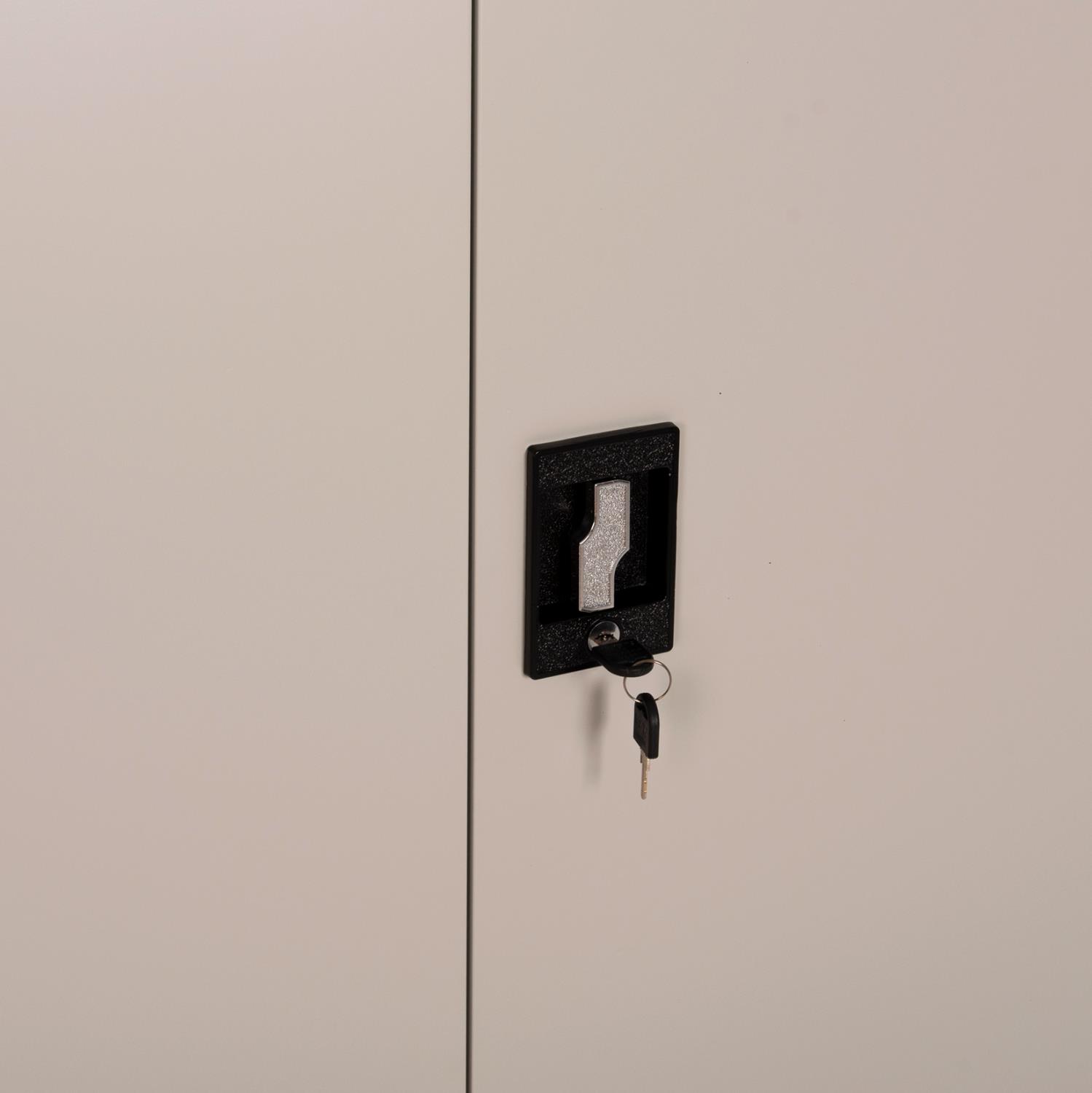 DURON is a practical metal closet that has been made with capacity and durability in mind. It is double leafed with the two doors closing right in the middle of the structure, while the interior is a single space without vertical partitions. It has 4 shelves that create 5 storage spaces. The doors have a lock that can be locked with a key, while the color of the wardrobe is a very light gray.