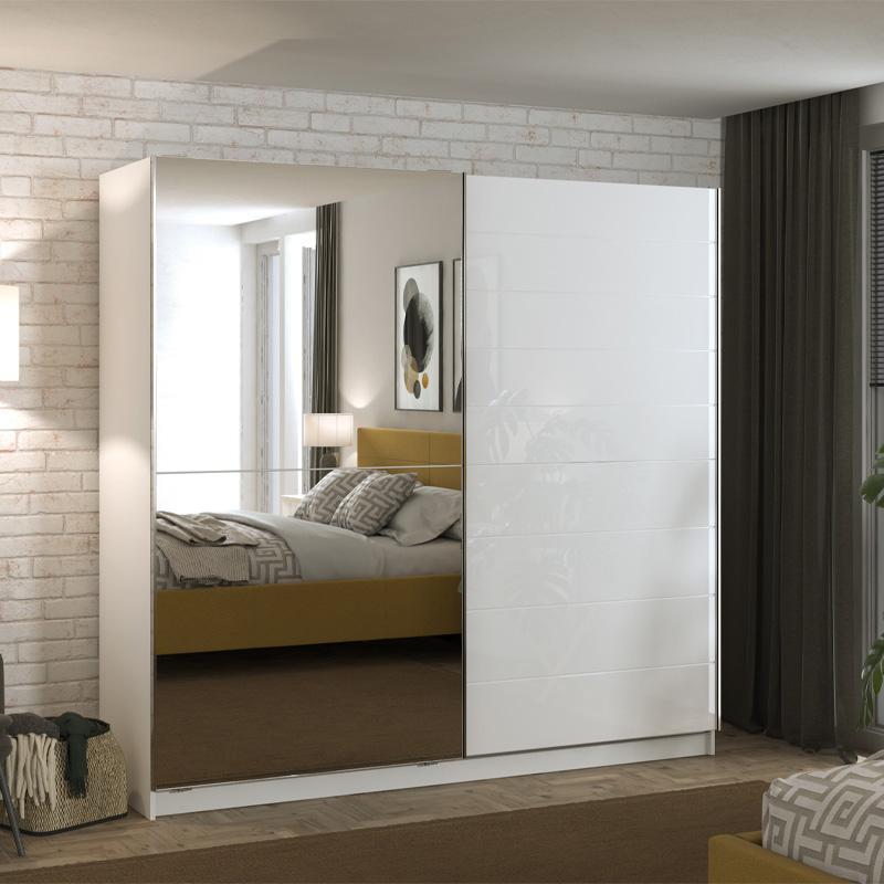 The Mondego 220 Sliding Bedroom Wardrobe with Mirror is the ideal choice for those who want an elegant, functional and modern storage solution for their bedroom. With the sophisticated combination of white color and glossy white MDF lacquer, this wardrobe offers a clean and bright appearance that highlights any room.