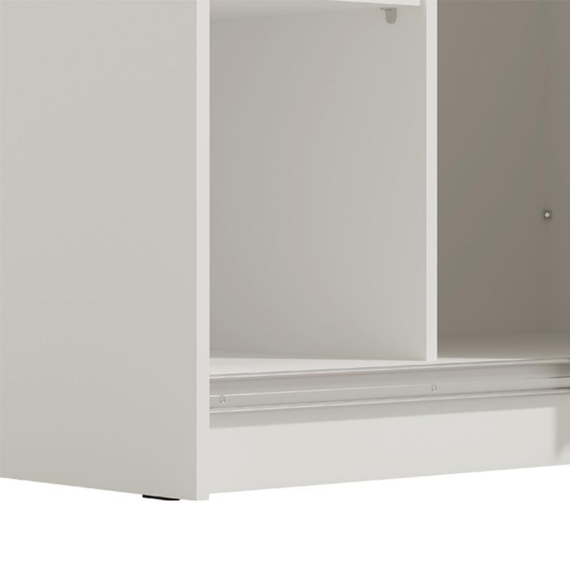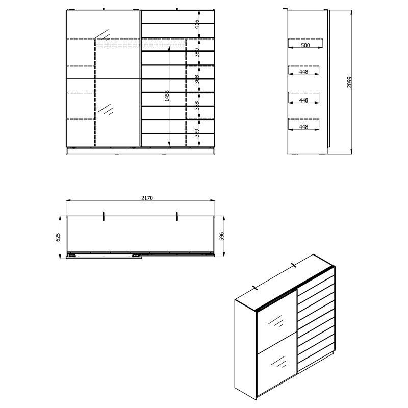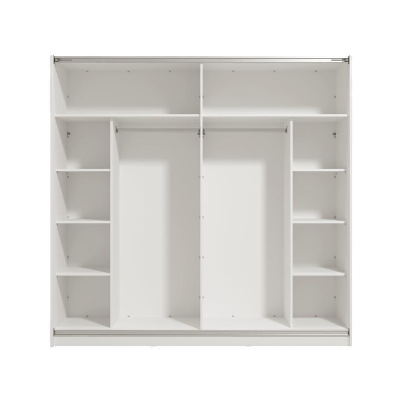 The Mondego 220 double-leaf sliding wardrobe offers not only visual and aesthetic appeal but also practicality as it has 2 identical storage spaces, where in the central section it has 2 spaces with metal hanging rails for your clothes and coats, while on the left and right of the wardrobe there are 3 shelves on each side which create a total of 8 storage spaces to store all your bed linens, clothes and other personal items. It also has additional space, on the top as a loft.