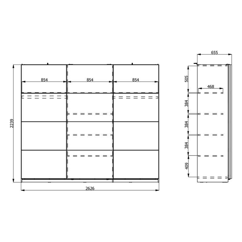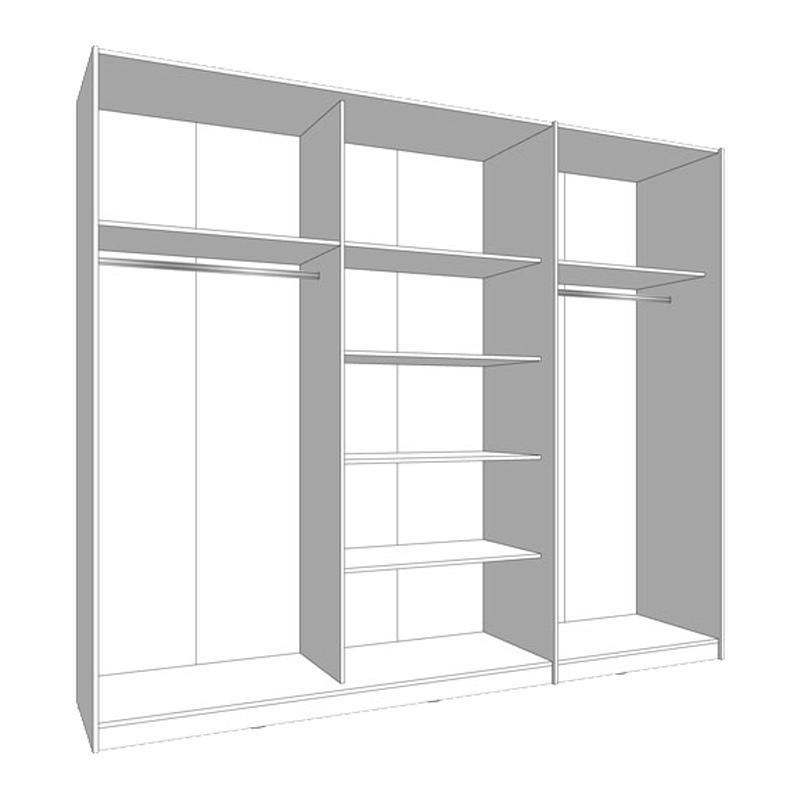 The interior of the three-leaf Sardinia sliding wardrobe is divided into 3 sections, where the left and right sections have a high space with a metal hanging rail for clothes and long coats and a storage space - loft at the top, while the central section has 4 shelves which create 5 large storage spaces to store all your bed linen, clothes and other personal items.