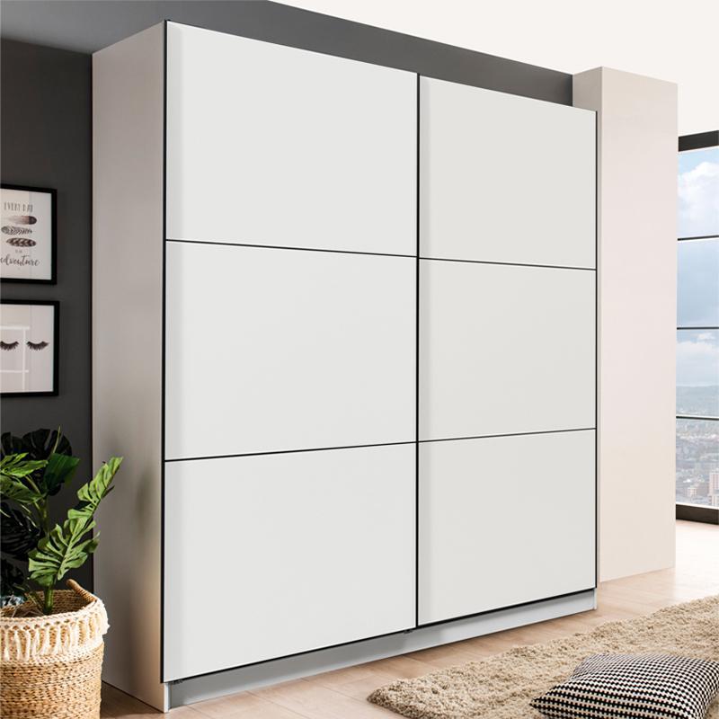 The white color of the SIERRA double-leaf sliding wardrobe creates a sense of purity and warmth, while its construction from chipboard with certified E1 melamine coating ensures long-term durability and easy maintenance.