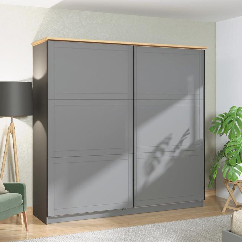 The Valencia 220 bedroom sliding wardrobe is the perfect choice to add light, elegance and functionality to your space. Its matte gray color, combined with its artisan oak element on the top, creates a sense of modernity and warmth, offering a timeless character.