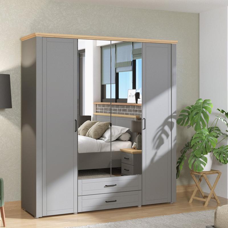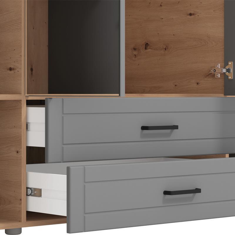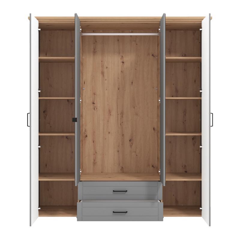 The Valencia bedroom wardrobe is the ideal solution to add light, functionality and elegance to your space. Its matte gray color, combined with artisan oak on the top and inside, creates a sense of modernity and warmth, offering a timeless and sophisticated character.