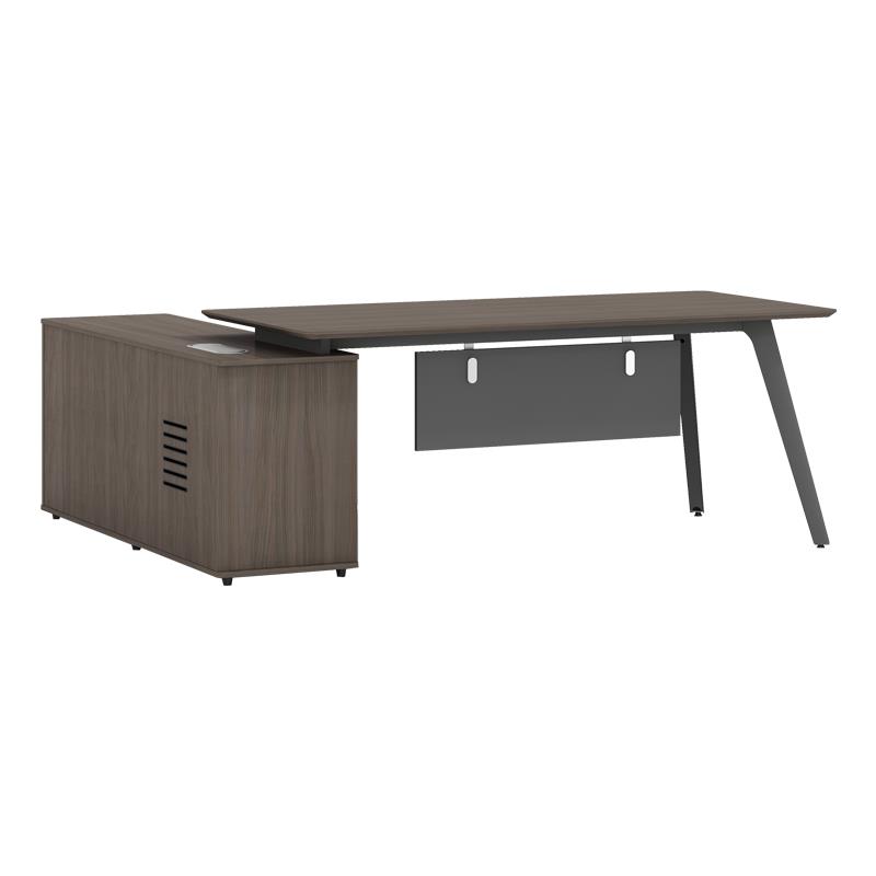 Executive desk with built-in corner cupboard (it is reversible), in the impressive walnut-anthracite colour. Made of high quality materials and according to today's ergonomic requirements.