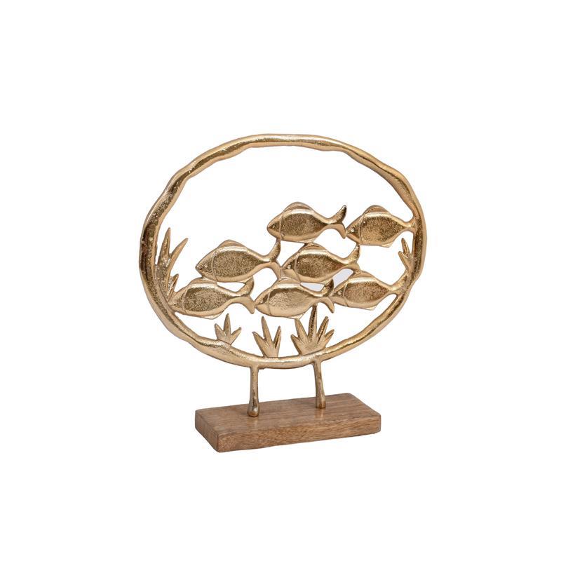 Φέρτε μια πινελιά θαλάσσιας γοητείας στο τραπέζι σας. Αυτό το επιτραπέζιο διακοσμητικό αλουμινίου Fish on ring 2803 με ξύλινη βάση αποτελεί μια κομψή και διαχρονική επιλογή για κάθε χώρο. Κατασκευασμένο από υψηλής ποιότητας αλουμίνιο και ξύλο, το διακοσμητικό διαθέτει ένα όμορφο ψάρι που προσθέτει μια πινελιά κομψότητας και φινέτσας. Η ανθεκτική ξύλινη βάση εξασφαλίζει σταθερότητα και ισορροπία, ενώ η χρυσή επιφάνεια του αλουμινίου προσδίδει μια αίσθηση πολυτέλειας.