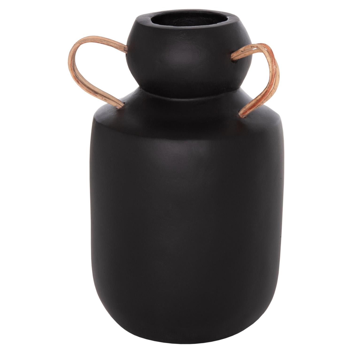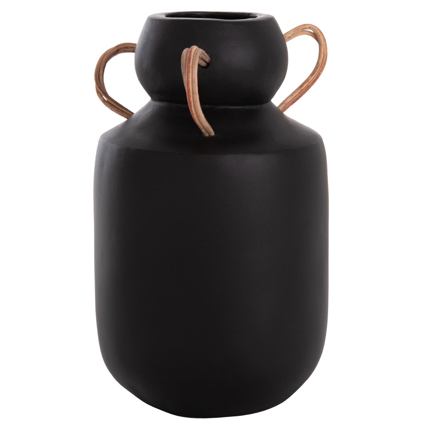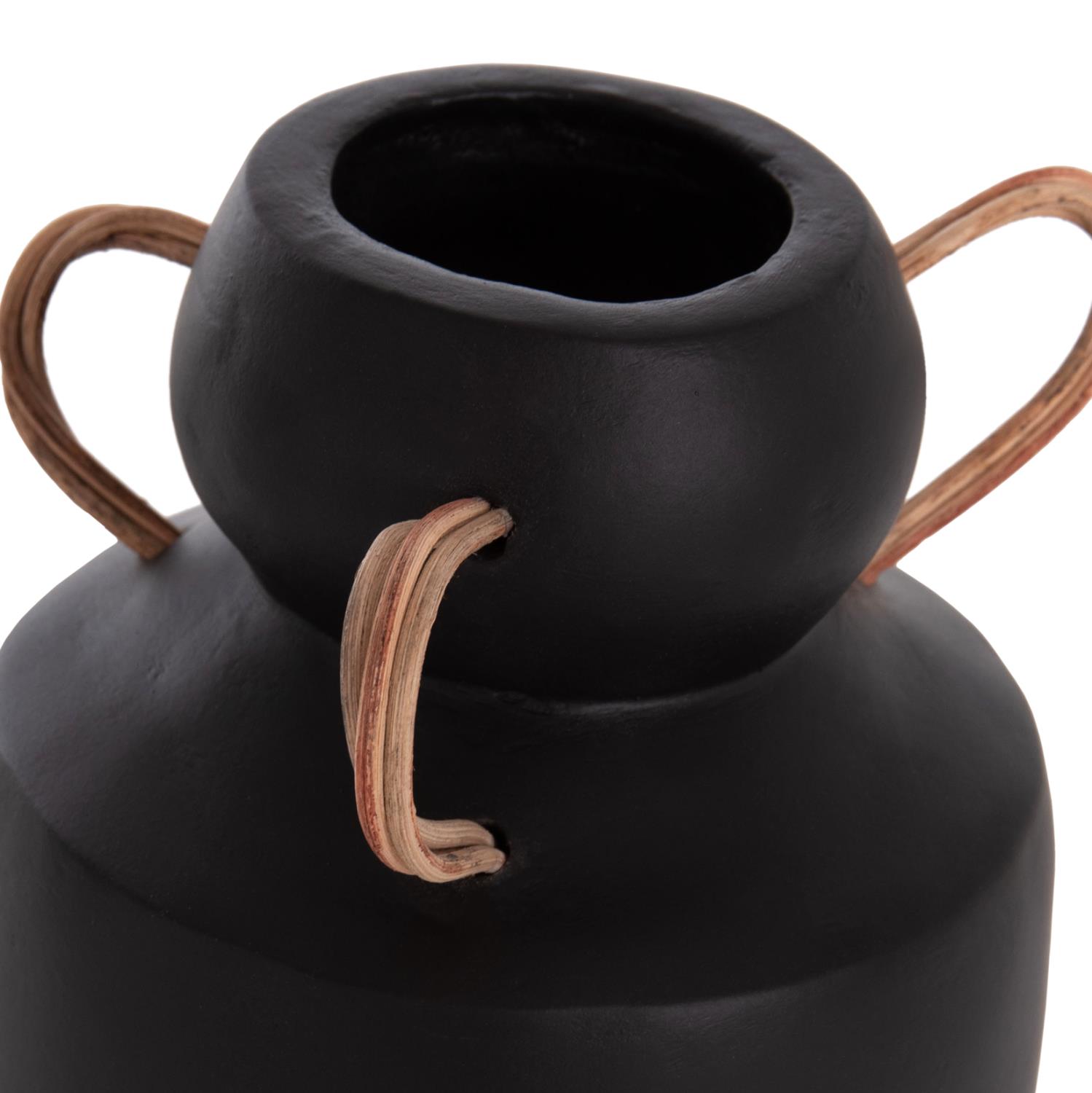 Το διακοσμητικό βάζο MIBO έχει κλασικό σχήμα ενώ διαθέτει χερούλια στο επάνω μέρος από φυσικό rattan. Είναι σε ΜΑΥΡΗ απόχρωση και μπορεί να ταιριάξει οπουδήποτε το θελήσετε. Είτε στο σπίτι είτε σε επαγγελματικούς χώρους.