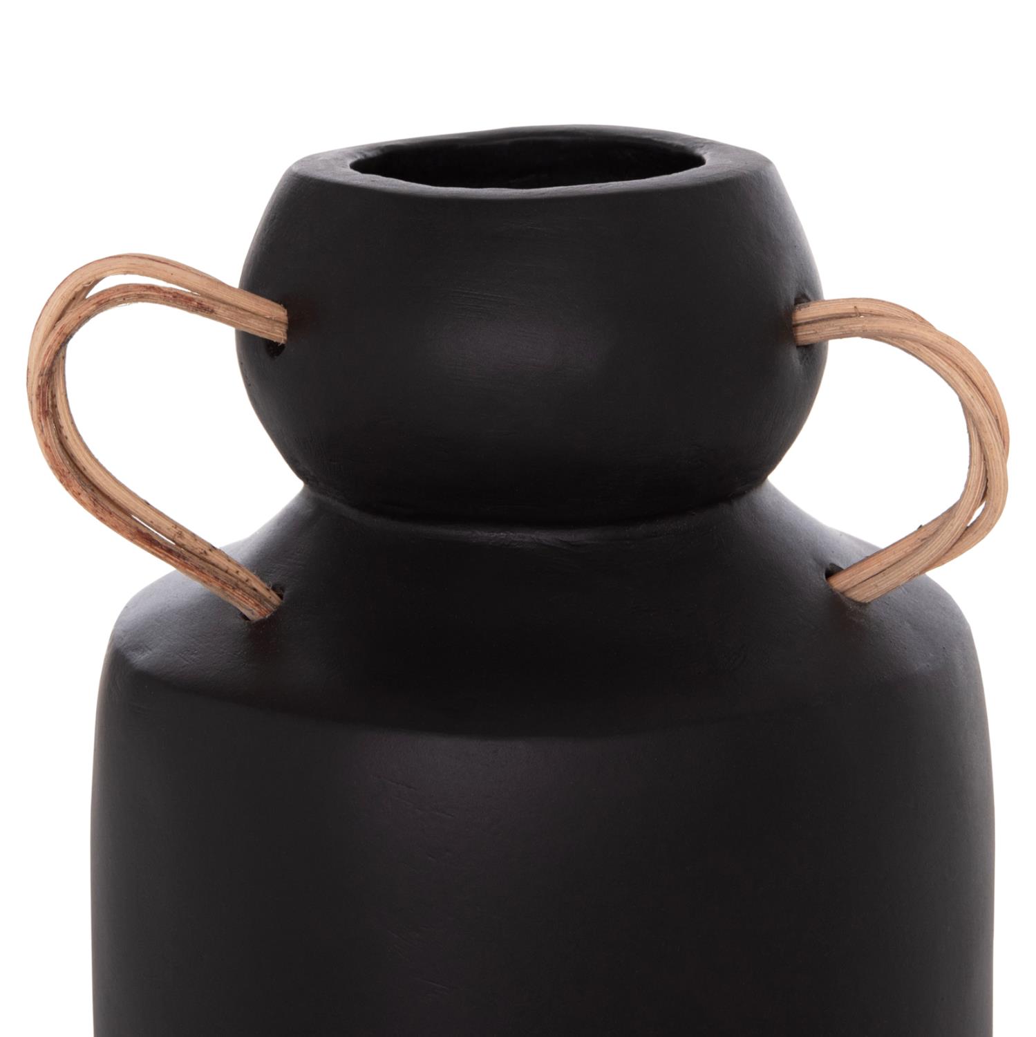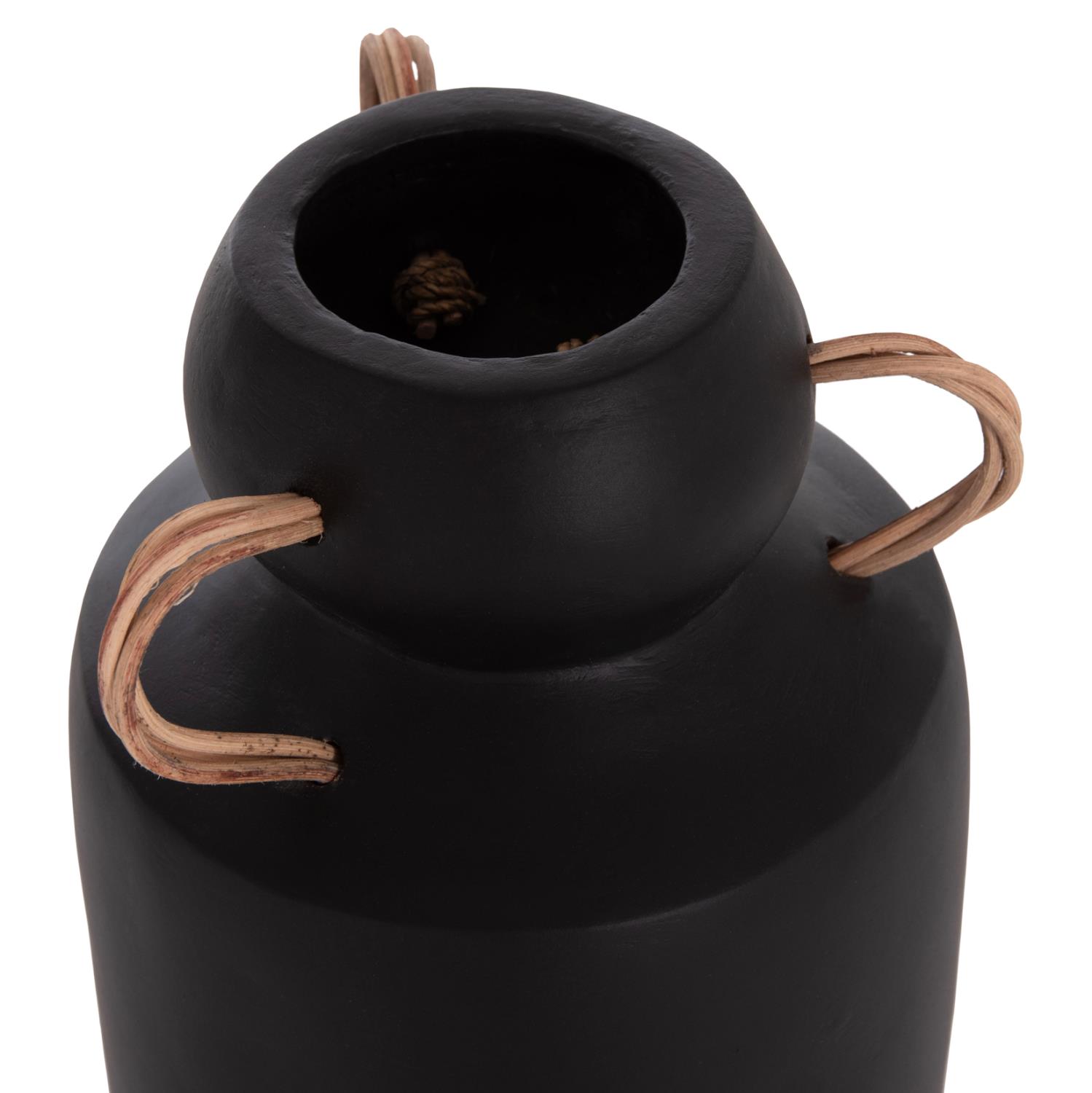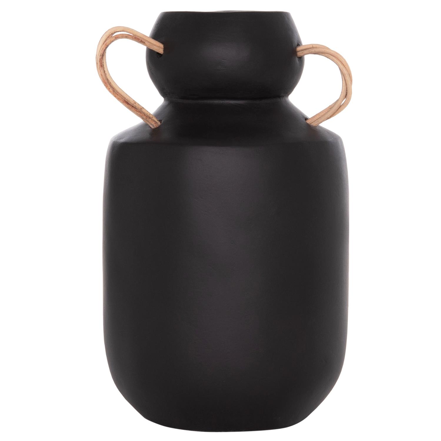 Το διακοσμητικό βάζο MIBO έχει κλασικό σχήμα ενώ διαθέτει χερούλια στο επάνω μέρος από φυσικό rattan. Είναι σε ΜΑΥΡΗ απόχρωση και μπορεί να ταιριάξει οπουδήποτε το θελήσετε. Είτε στο σπίτι είτε σε επαγγελματικούς χώρους.