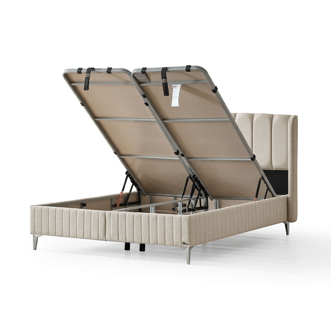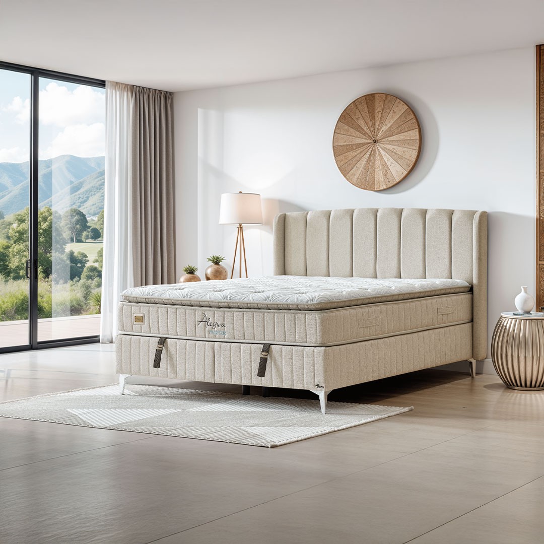 Το κομψά επενδυμένο κρεβάτι ALLEGRA διαθέτει μοντέρνο κεφαλάρι με κάθετες ραφές και πολυτελές ύφασμα σε μπέζ απόχρωση, αποπνέοντας διακριτική κομψότητα. Ο στιβαρός του σκελετός προσφέρει ευρύχωρο διπλό αποθηκευτικό χώρο, με μηχανισμό ανύψωσης υψηλής αντοχής για εύκολη και ασφαλή πρόσβαση — ιδανικό για ρούχα, κλινοσκεπάσματα ή εποχιακά είδη.