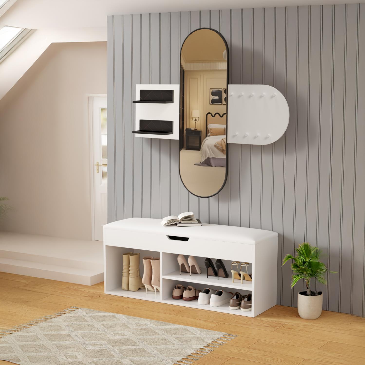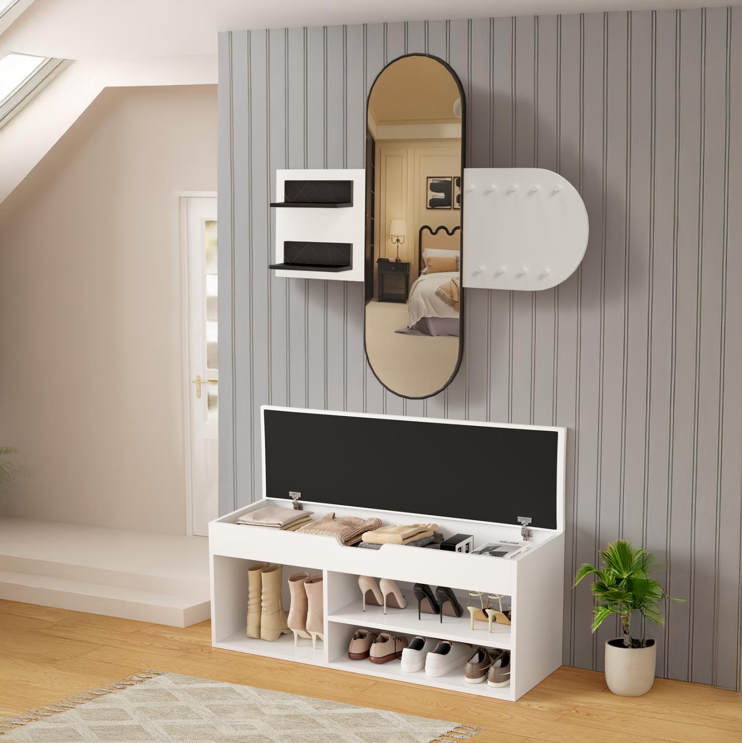 Μία παπουτσοθήκη σε ΛΕΥΚΟ χρώμα με κάθισμα επενδυμένο με PU δέρμα. Ο χώρος αποθήκευσης είναι ανοιχτός με 2 επίπεδα στην μια πλευρά και έναν μεγαλύτερο στην άλλη για ψηλότερα παπούτσια, ενώ κάτω από το κάθισμα που ανασηκώνεται υπάρχει ακόμα ένας, πιο ρηχός, χώρος αποθήκευσης αντικειμένων.