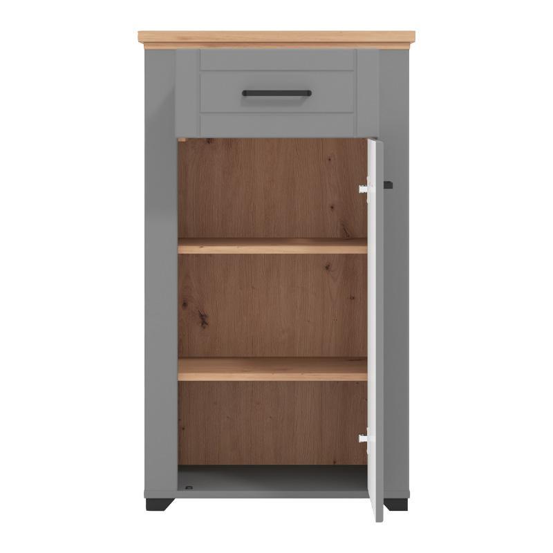 Η κομψή εμφάνιση του Valencia συνδυάζει το γκρι του γραφίτη, το artisan oak και τη γκρι μελαμίνη με ματ επιφάνειες σε MDF, δημιουργώντας μια ζεστή και μοντέρνα ατμόσφαιρα που ενσωματώνεται εύκολα σε οποιοδήποτε στυλ διακόσμησης. Η πλαστική μαύρη χειρολαβή προσφέρει ευκολία στη χρήση και προσθέτει μια ακόμη λεπτομέρεια κομψότητας.