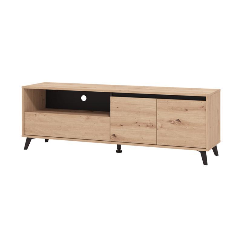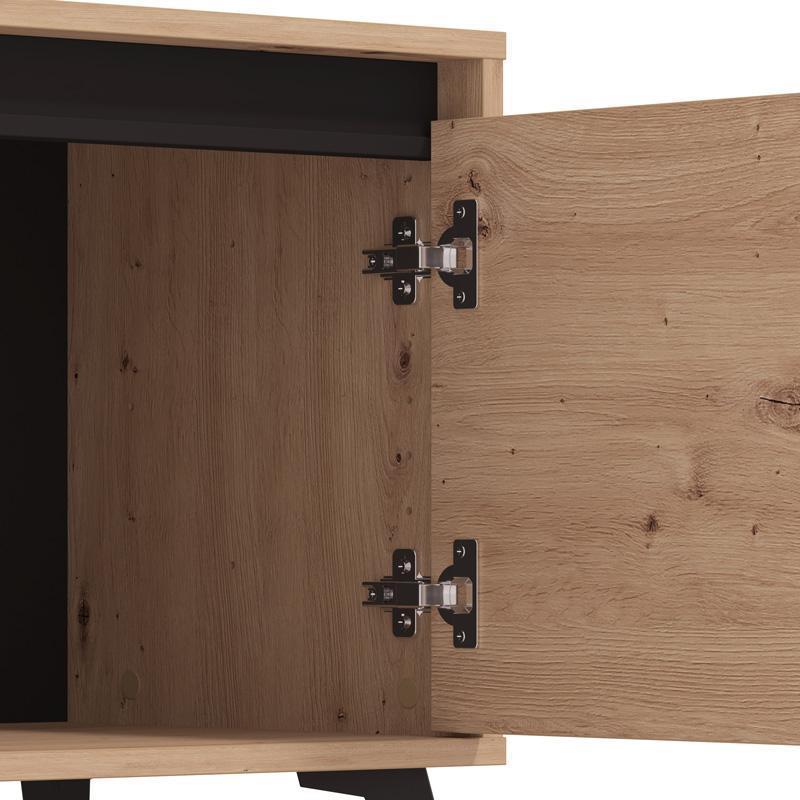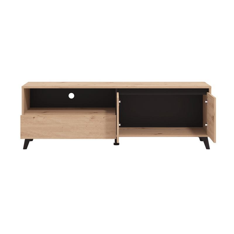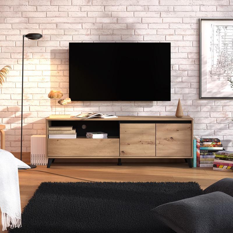 Το έπιπλο τηλεόρασης Stirling 157 3K1F2V,σύγχρονης σχεδίασης, συνδυάζει λειτουργικότητα και αισθητική. Διαθέτει, στο δεξί τμήμα του, έναν ενιαίο χώρο αποθήκευσης με δύο πόρτες για να κρατάει τα αντικείμενά σας οργανωμένα και κρυμμένα, ενώ στο αριστερό τμήμα του διαθέτει έναν ανοικτό αποθηκευτικό χώρο για την τοποθέτηση συσκευών ήχου, όπως ηχομπάρες ή ενισχυτές, παρέχοντας εύκολη πρόσβαση και εξοικονόμηση χώρου, ενώ απο κάτω του υπάρχει ένα συρτάρι. Το υλικό μελαμίνης εξασφαλίζει αντοχή και εύκολη συντήρηση, ενώ η κομψή του εμφάνιση, σε συδνυασμό αποχρώσεων artisan oak και μαύρο ματ, ταιριάζει σε κάθε μοντέρνο ή κλασικό σαλόνι.