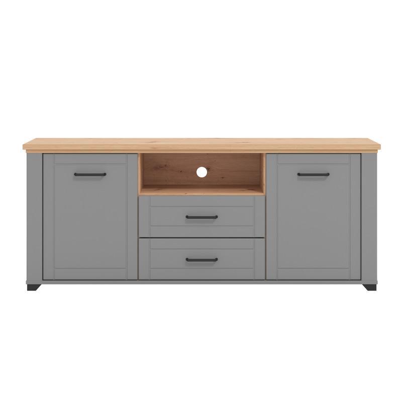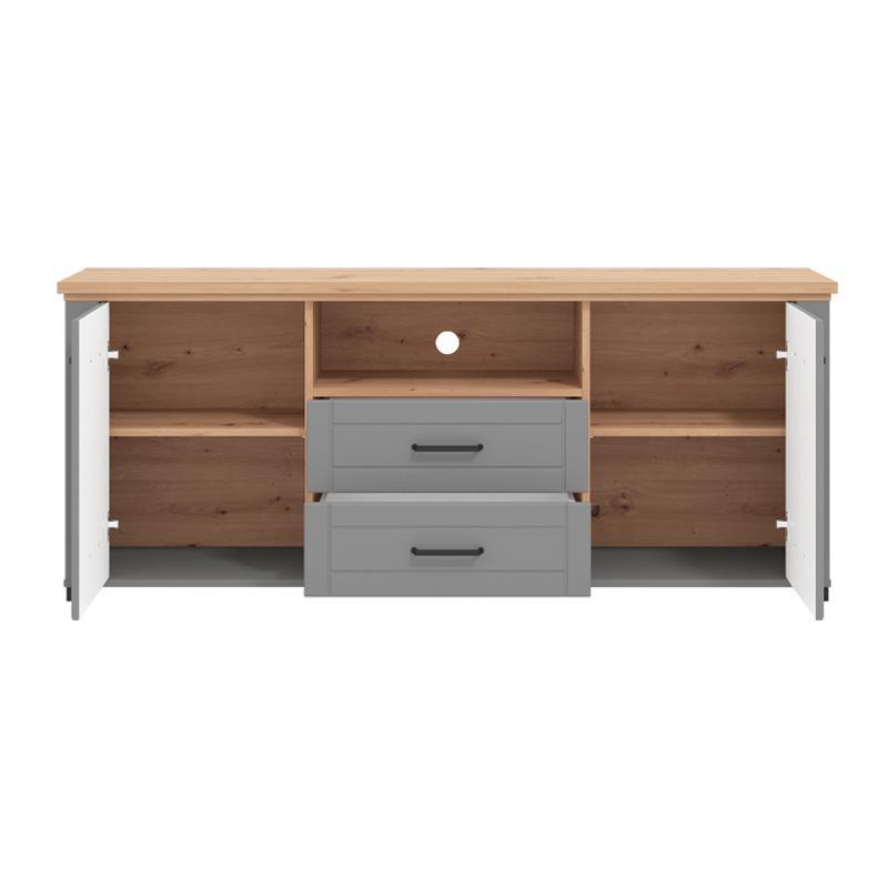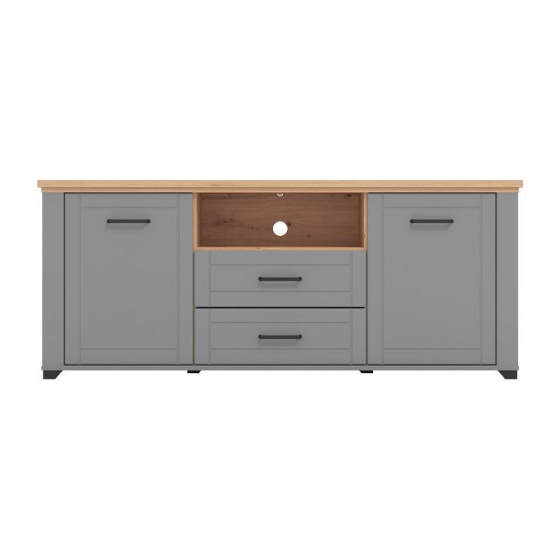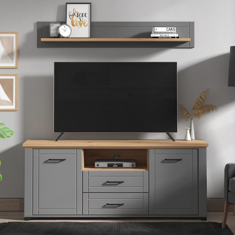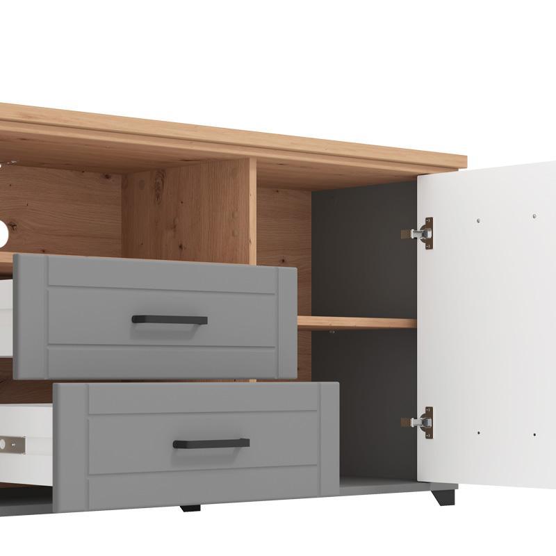 Ο λειτουργικός σχεδιασμός του περιλαμβάνει δύο συρτάρια και ντουλάπια, προσφέροντας άφθονο αποθηκευτικό χώρο για την οργάνωση των ηλεκτρονικών σας συσκευών, τηλεχειριστηρίων, βιβλίων και διακοσμητικών αντικειμένων. Οι καθαρές γραμμές και η προσεγμένη λεπτομέρεια το καθιστούν μια εξαιρετική προσθήκη που αναβαθμίζει κάθε καθιστικό.