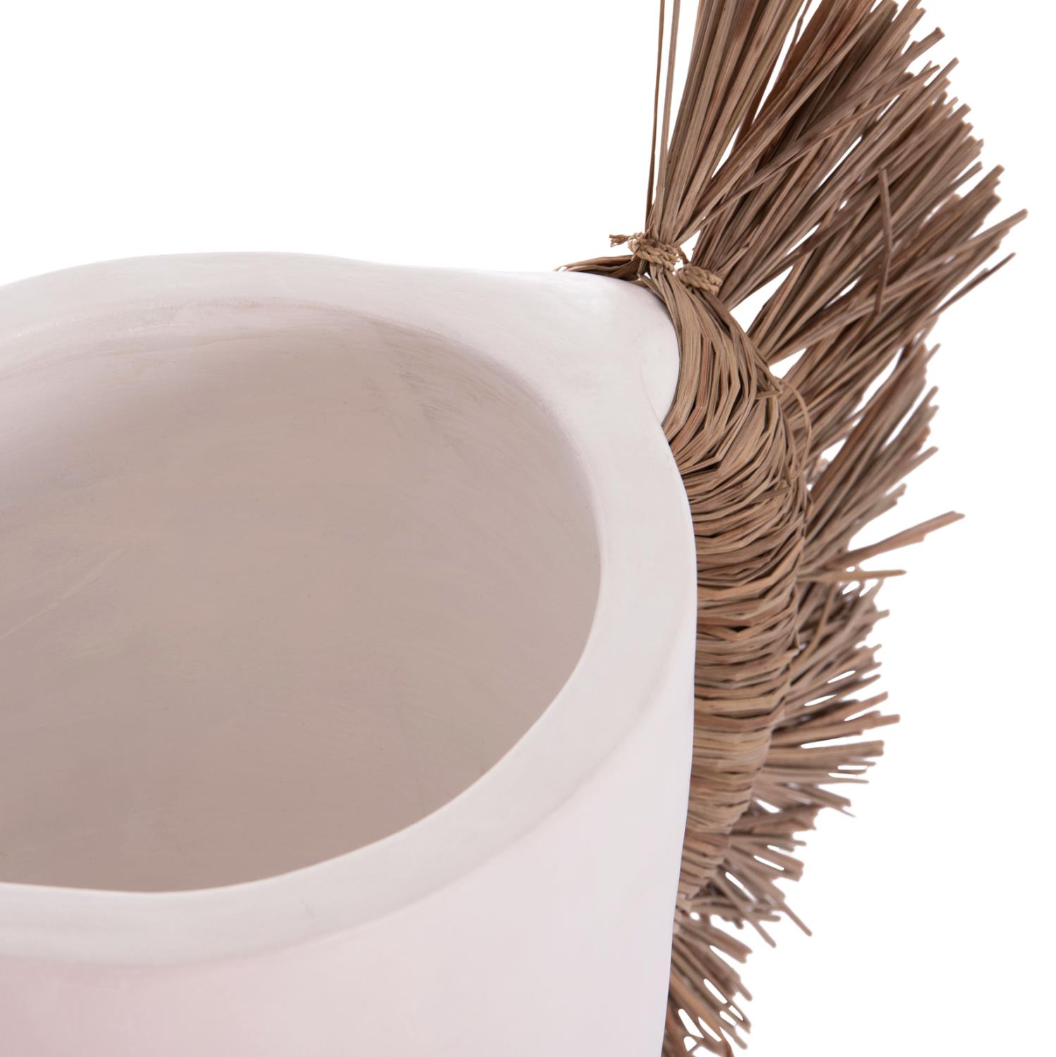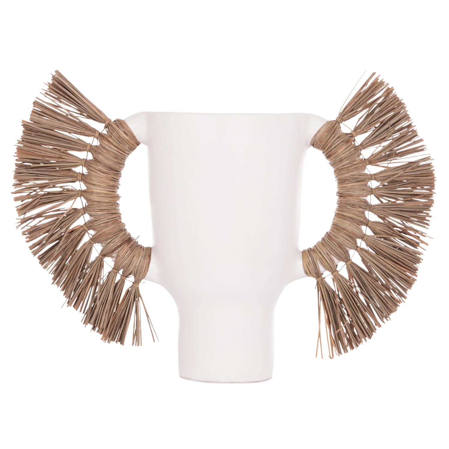 Το επιτραπέζιο χειροποίητο διακοσμητικό βάζο ALICA είναι ένα πολύ ιδιαίτερο διακοσμητικό στοιχείο για κάθε χώρο. Είναι κατασκευασμένο εξολοκλήρου από τερακότα σε ΛΕΥΚΟ χρώμα, ενώ διαθέτει και δύο χερούλια επενδυμένα με αποξηραμένο grass, και ένα φαρδύ στόμιο.