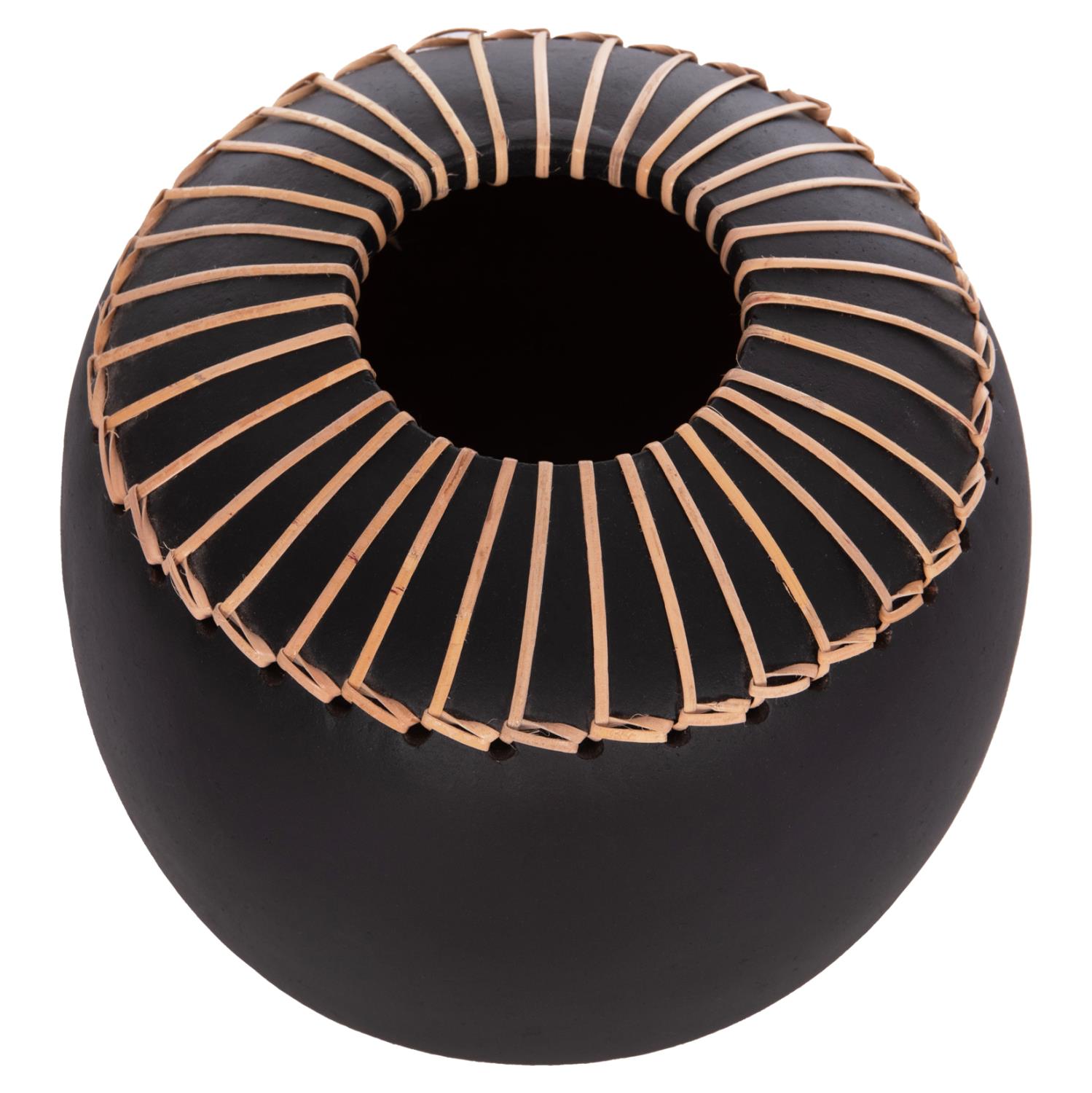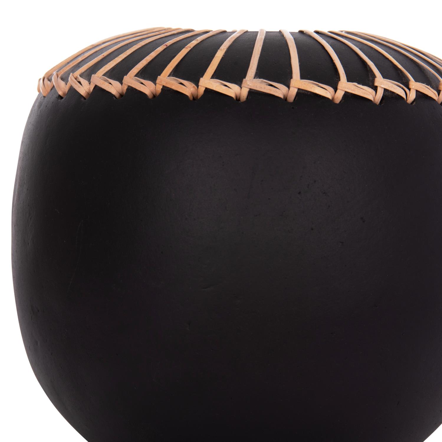 Το χειροποίητο επιτραπέζιο διακοσμητικό βάζο LENNOX είναι ένα όμορφο διακοσμητικό στοιχείο για κάθε χώρο. Είναι σχετικά κοντό αλλά φαρδύ και κατασκευασμένο εξολοκλήρου από τερακότα σε ΜΑΥΡΟ χρώμα ενώ το στόμιο είναι διακοσμημένο με μια πλέξη από φυσικό rattan. Ιδανικό για πληθώρα χρήσεων και χώρων.