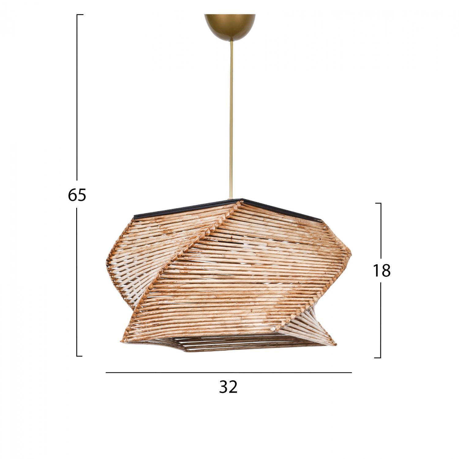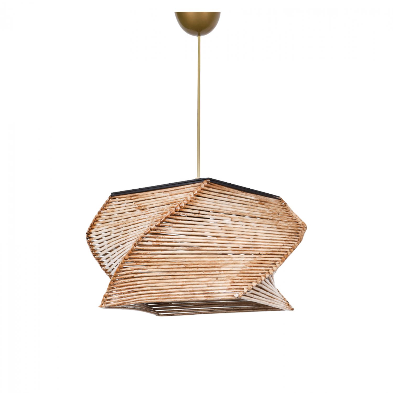 Μοντέρνο κρεμαστό φωτιστικό οροφής, κατασκευασμένο από ξύλινο σκελετό και επενδυμένο από bamboo υλικό σε φυσική απόχρωση με μαύρες λεπτομέρειες στο τελείωμα του καπέλου.