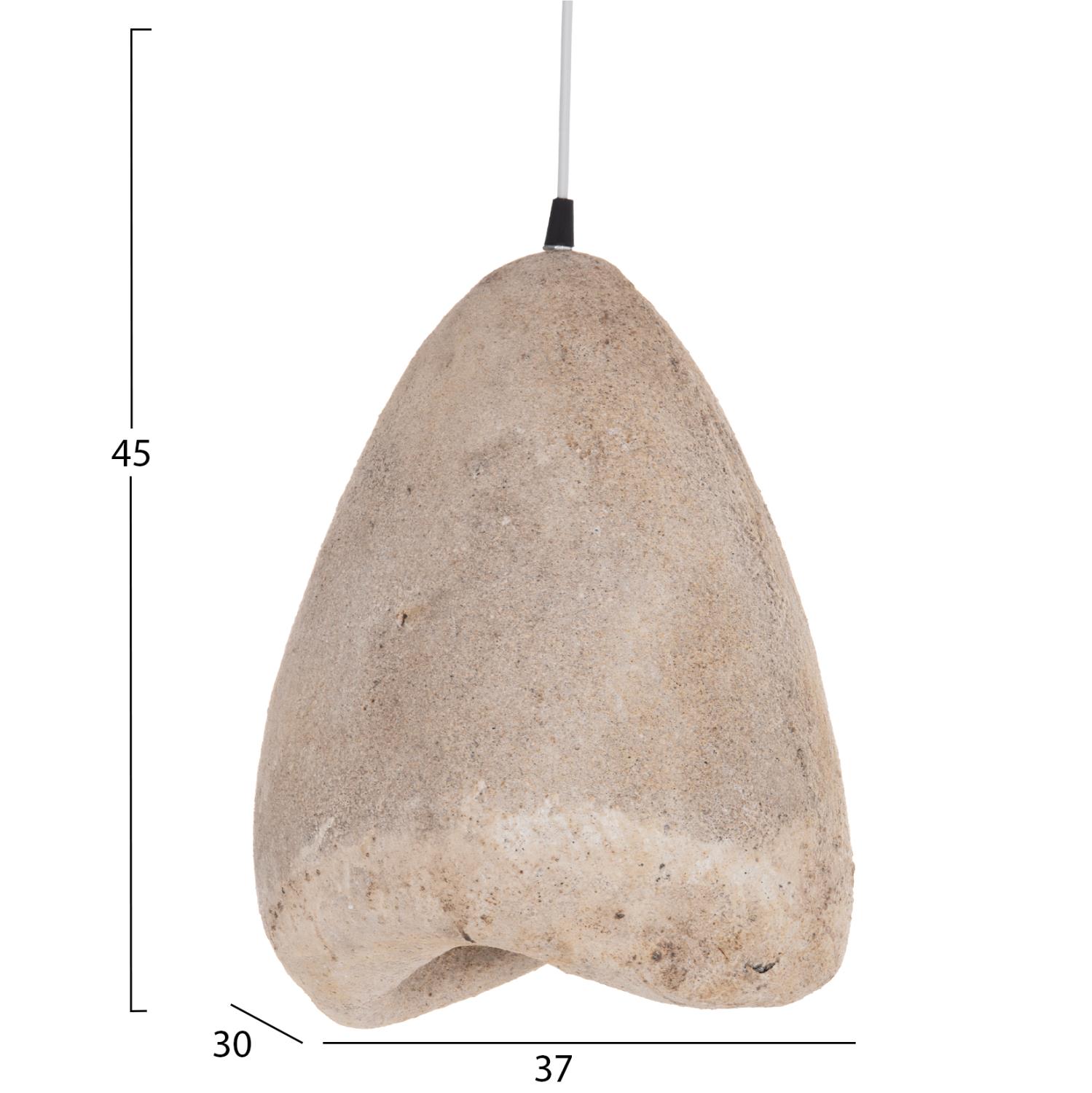 Αυτό το κρεμαστό φωτιστικό οροφής σε σχήμα πέτρας είναι κατασκευασμένο από RESIN (ΡΗΤΙΝΗ) ημιδιάφανο υλικό σε σκούρο μπεζ χρώμα και διαχέει τον φωτισμό απαλά στο χώρο, δημιουργώντας μια όμορφη ατμόσφαιρα. Αποτελεί κυρίως διακοσμητικό στοιχείο στον χώρο και απαιτεί ανάλογο περιβάλλον.