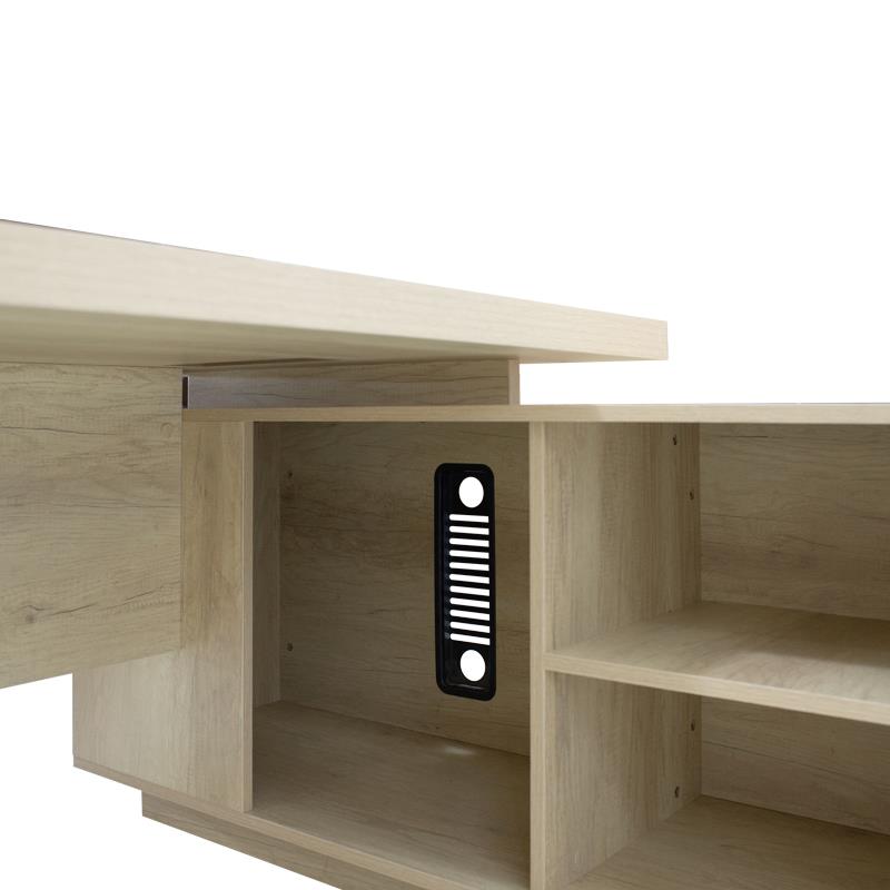 - Κύριο γραφείο: Επιφάνεια κατασκευασμένη από μοριοσανίδα με επένδυση μελαμίνης υψηλής ποιότητα, πάχους 25 χιλ. Τα πλαϊνά μέρη φέρουν μοριοσανίδα με επένδυση μελαμίνης, όλα σε φυσικό χρώμα.