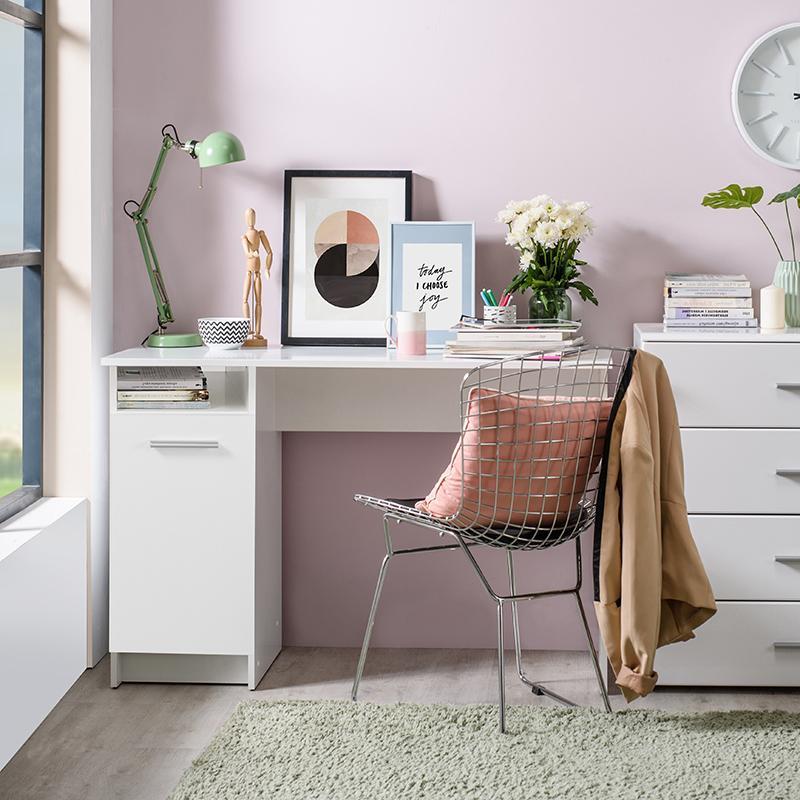 Το γραφείο υπολογιστή REY, σε φωτεινή λευκή απόχρωση, αποτελεί πρακτική λύση για εξοπλισμό του χώρου εργασίας χάρη στον αρμονικό σχεδιασμό και τις διαστάσεις του. Αυτό το μοντέλο γραφείου διαθέτει ένα ντουλάπι με διαχωριστικό ράφι στη μέση καθώς και ένα ακόμα ανοιχτό ράφι πάνω απο το ντουλάπι.