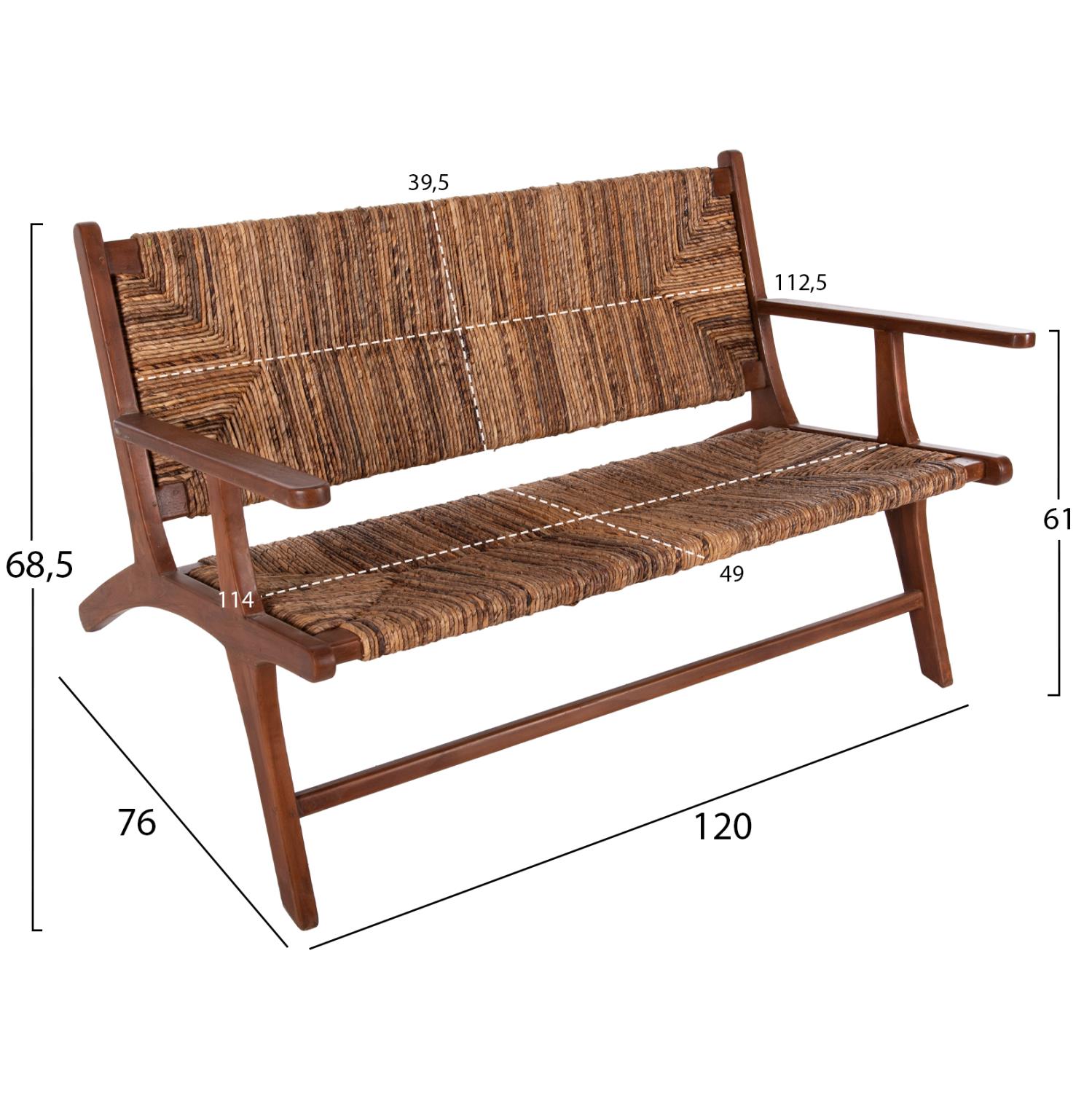 Ο καναπές 2 θέσεων TONDO είναι κοντός και φαρδύς με μπράτσα απαράμιλλης ομορφιάς. Ο πανέμορφος σκελετός του είναι από ποιοτικό ξύλο σε ΚΑΡΥΔΙ χρώμα, ενώ τόσο η μεσαίου ύψους πλάτη όσο και το φαρδύ κάθισμα αποτελούνται από σχοινί μπανάνας (ψάθα) στο ΦΥΣΙΚΟ του χρώμα. Οι σχεδιαστικές γραμμές είναι κομψές και με γνώμονα την άνεση του χρήστη, με χαρακτηριστικό παράδειγμα το κοντό κάθισμα με την έντονη κλίση και την πλάτη με την επίσης χαρακτηριστική κλίση προς τα πίσω.