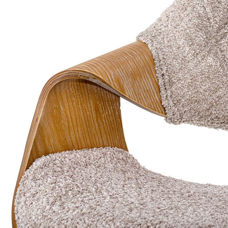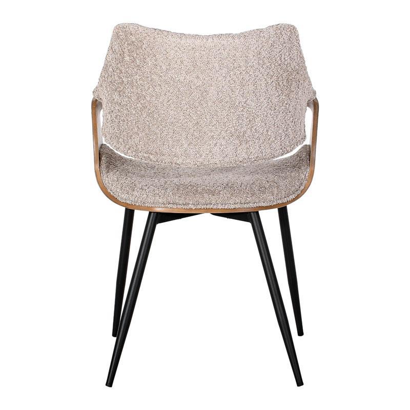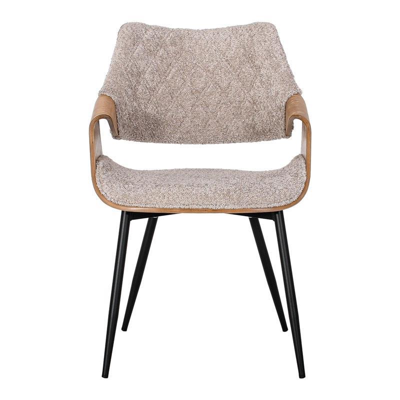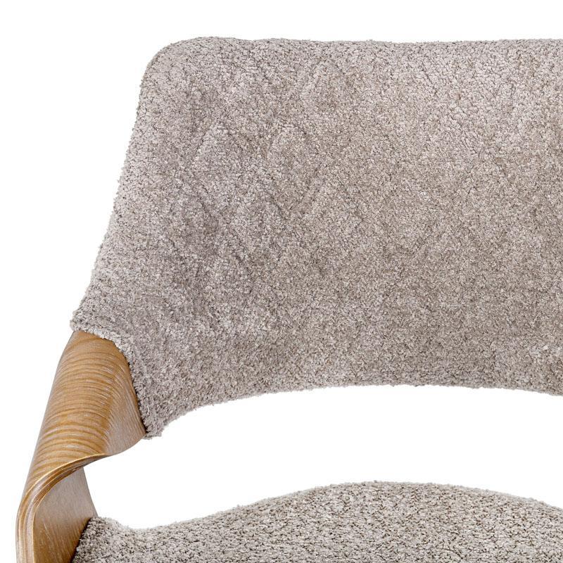 Ο σκελετός από polywood εξασφαλίζει ελαφρύ βάρος και μεγάλη αντοχή, ενώ η επένδυση με πολυεστερικό ύφασμα προσφέρει αίσθηση ζεστασιάς και πολυτέλειας, καθιστώντας την ιδανική επιλογή για δημιουργία ενός άνετου περιβάλλοντος. Τα μεταλλικά πόδια, με ηλεκτροστατική βαφή, προσφέρουν σταθερότητα και μοντέρνα εμφάνιση, συμπληρώνοντας τη γενική αισθητική της καρέκλας.