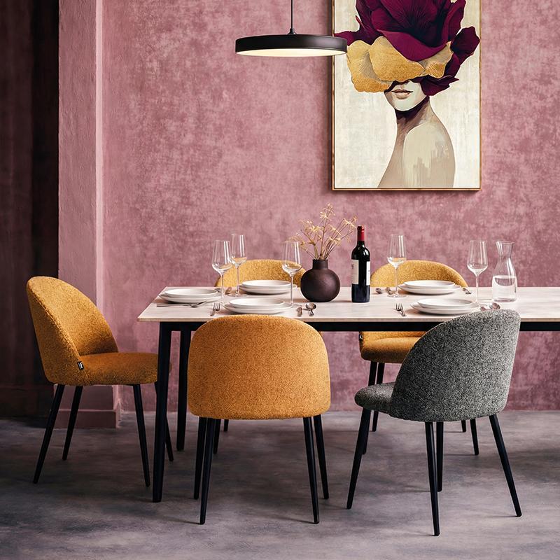 Μοντέρνα και άνετη η καρέκλα τραπεζαρίας Lily, σχεδιασμένη για καθημερινή χρήση σε σπίτια και χώρους εστίασης. Το καθιστικό της προσφέρει άνεση με επένδυση υφάσματος υψηλής ποιότητας, ενώ τα μεταλλικά πόδια με μαύρη πούδρα εξασφαλίζουν στιβαρότητα και αντοχή στο χρόνο. Ιδανική για σύγχρονα σαλόνια, τραπεζαρίες και επαγγελματικούς χώρους με κομψό στυλ.