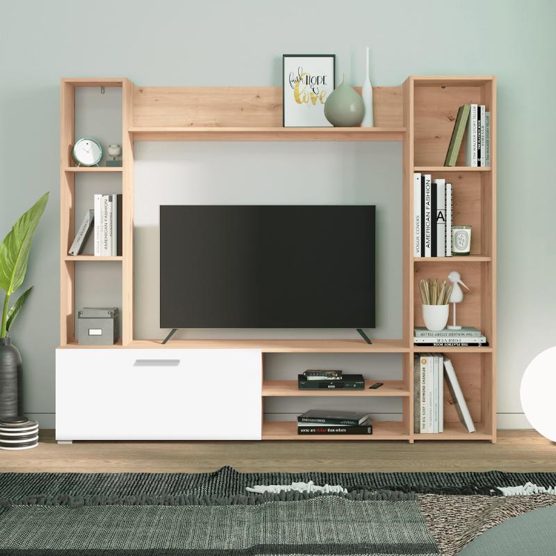 Ο συνδυασμός Artisan Oak και Λευκού προσδίδει μια ζεστή και φωτεινή αίσθηση, καθιστώντας τη σύνθεση κατάλληλη τόσο για μοντέρνα όσο και για πιο κλασικά διακοσμητικά περιβάλλοντα. Οι ανοιχτοί χώροι και τα ράφια επιτρέπουν την τοποθέτηση διακοσμητικών, βιβλίων ή μικρών συσκευών, διατηρώντας το καθιστικό σας οργανωμένο και καλαίσθητο.