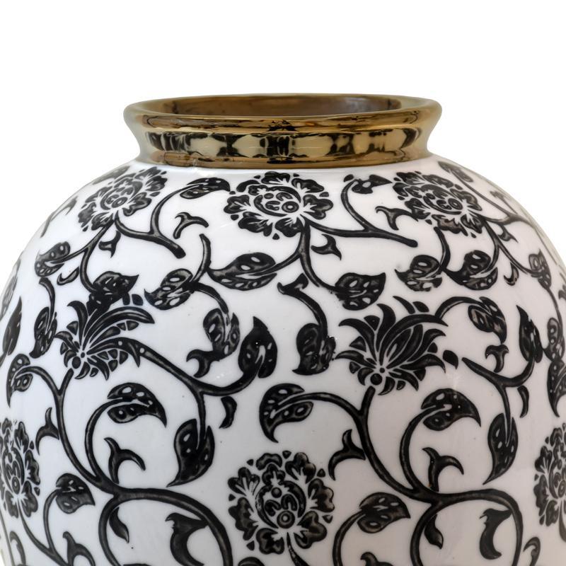 Δώστε έναν αέρα πολυτέλειας και σύγχρονης αισθητικής στον χώρο σας με αυτό το κεραμικό βάζο FL22855 σε μαύρες, λευκές και χρυσές αποχρώσεις. Ο εντυπωσιακός συνδυασμός των χρωμάτων το καθιστά ένα διακοσμητικό διαχρονικό κομμάτι, που τραβάει το βλέμμα και αναβαθμίζει κάθε δωμάτιο.