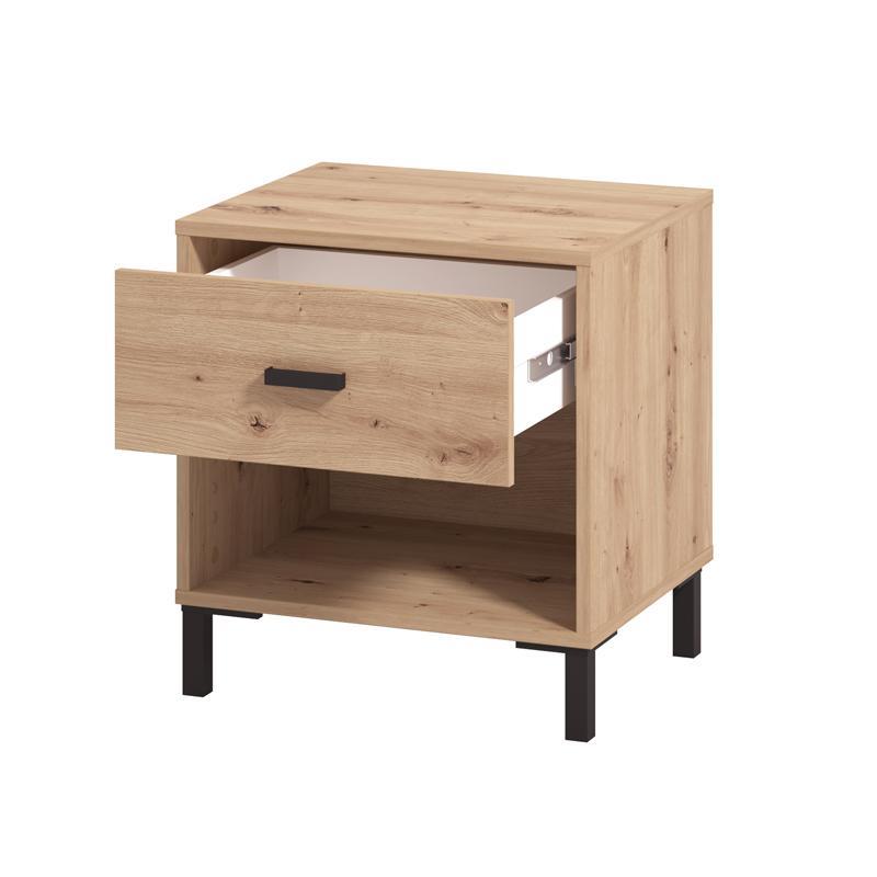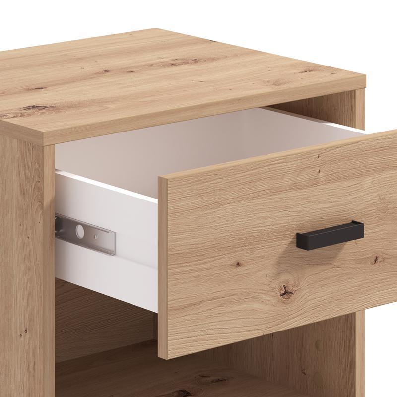 Το κομοδίνο Aleria διαθέτει 1 συρτάρι και ένα ράφι, ιδανικά για την αποθήκευση μικρών προσωπικών αντικειμένων, ρούχων ή αξεσουάρ, προσφέροντας άμεση και οργανωμένη πρόσβαση σε αυτά. Ο σχεδιασμός του είναι λιτός και κομψός, ιδανικός για κάθε υπνοδωμάτιο, προσφέροντας μια μοντέρνα και ταυτόχρονα λειτουργική λύση αποθήκευσης. Η κατασκευή του είναι στιβαρή και ανθεκτική, ενώ τα συρτάρια ανοίγουν και κλείνουν ομαλά για εύκολη χρήση. Το κομοδίνο προσφέρει επίσης έναν επιπλέον χώρο στην επιφάνειά του για να τοποθετήσετε αντικείμενα όπως το κινητό σας, φωτιστικά ή βιβλία. Το κομοδίνο αυτό μπορεί να ταιριάξει σε οποιοδήποτε στυλ διακόσμησης, ενώ η λειτουργικότητα του το καθιστά ιδανικό για την καθημερινή χρήση δίπλα στο κρεβάτι, προσφέροντας τόσο πρακτικότητα όσο και αισθητική στον χώρο σας.
