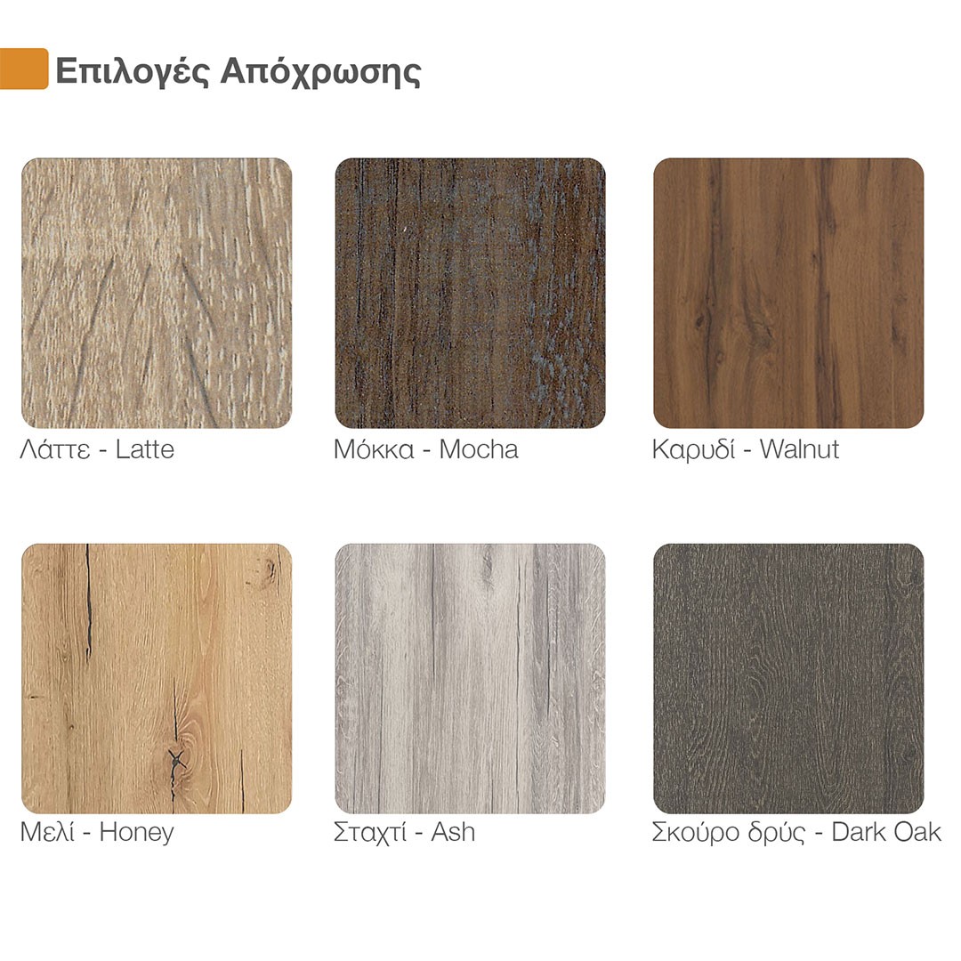 Διαθέσιμες επιλογές - 6 επιλογές απόχρωσης ξύλου: Λάττε, Μόκκα, Μελί, Σταχτί, Καρυδί & Σκούρο Δρύς