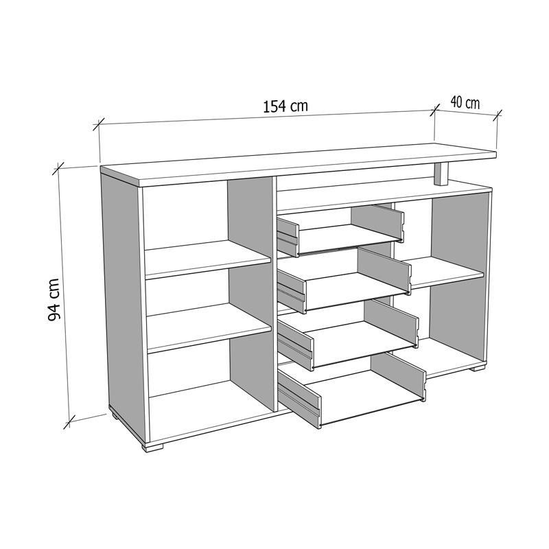 Ο μπουφές Aterno 154 συνδυάζει εξαιρετική ποιότητα κατασκευής με έναν πρακτικό και σύγχρονο σχεδιασμό για να εξυπηρετήσει τις ανάγκες αποθήκευσης του χώρου σας. Κατασκευασμένος από μοριοσανίδα 25mm, προσφέρει μεγάλη ανθεκτικότητα και μακροχρόνια χρήση. Διαθέτει δύο χώρους αποθήκευσης, που αποτελούνται από 5 ράφια, προσφέροντας άφθονο χώρο για την αποθήκευση ρούχων, αξεσουάρ, βιβλίων ή άλλων αντικειμένων. Οι δύο αυτοί χώροι κλείνουν με δύο πορτάκια για οργανωμένη και ασφαλή αποθήκευση.Επιπλέον, ο μπουφές διαθέτει 4 συρτάρια αποθήκευσης, ιδανικά για την τοποθέτηση μικρότερων αντικειμένων, όπως κλειδιά, έγγραφα ή διάφορα προσωπικά είδη.