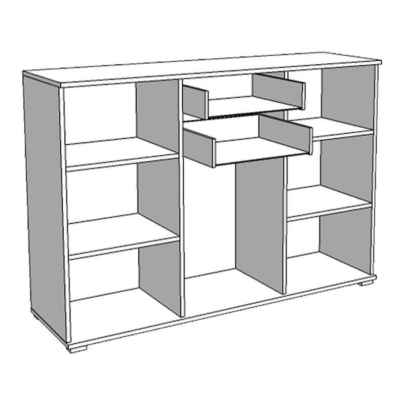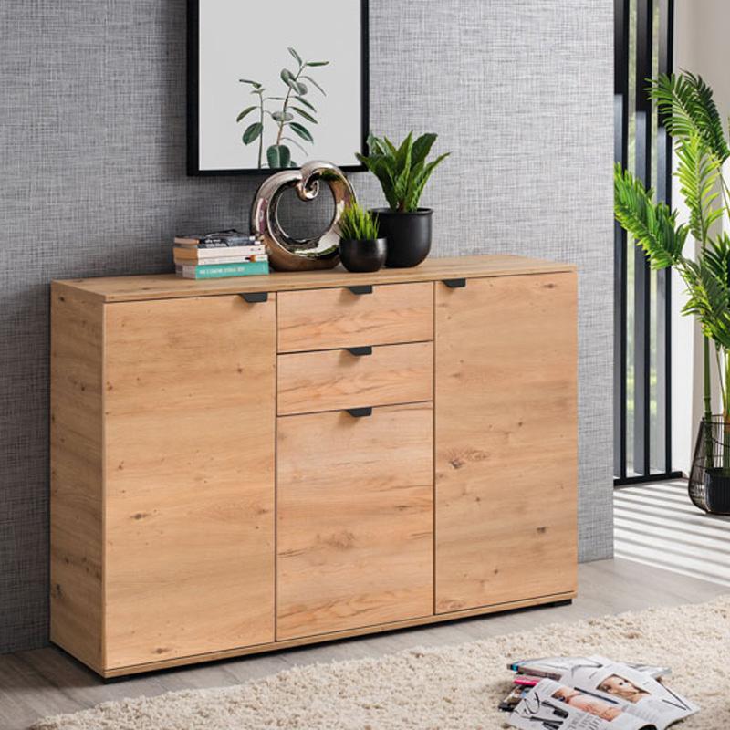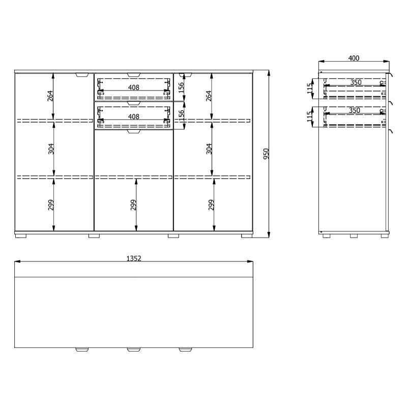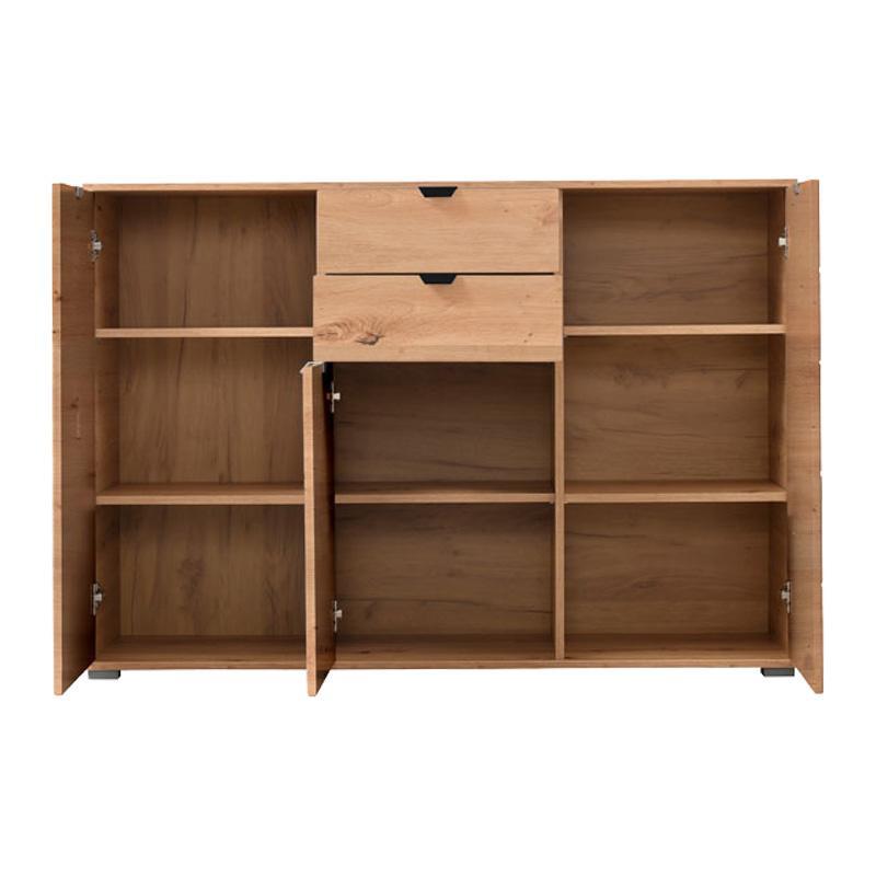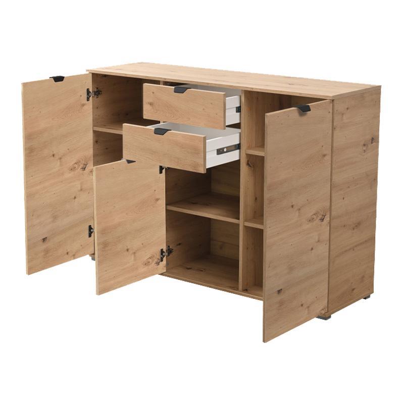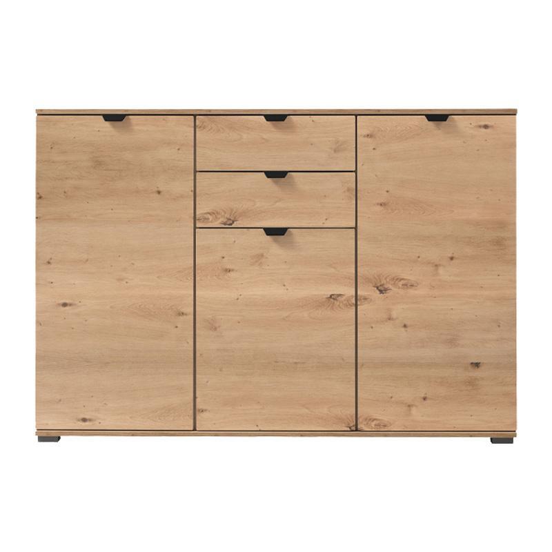 Η κομότα διαθέτει τρία ντουλάπια και δύο συρτάρια, προσφέροντας άπλετο χώρο για να αποθηκεύσετε τα ρούχα σας, προσωπικά έγγραφα ή άλλες μικρές ανάγκες, ενώ η μαύρη πλαστική χειρολαβή προσθέτει μια μοντέρνα και λειτουργική λεπτομέρεια.