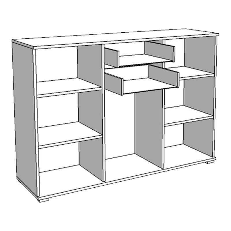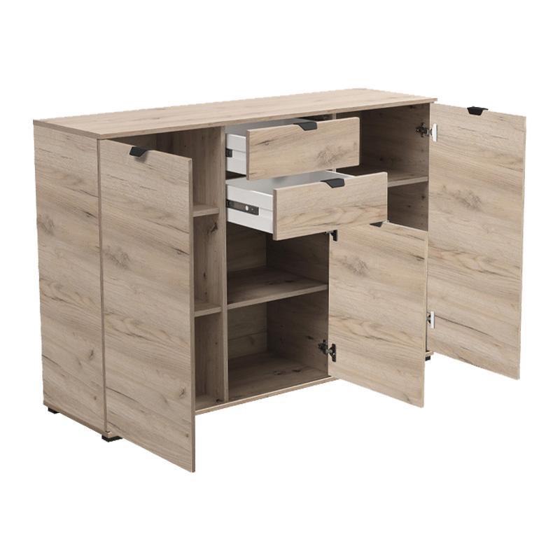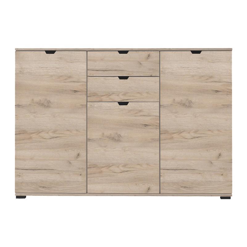 Η κομότα διαθέτει τρία ντουλάπια και δύο συρτάρια, προσφέροντας άπλετο χώρο για να αποθηκεύσετε τα ρούχα σας, προσωπικά έγγραφα ή άλλες μικρές ανάγκες, ενώ η μαύρη πλαστική χειρολαβή προσθέτει μια μοντέρνα και λειτουργική λεπτομέρεια.